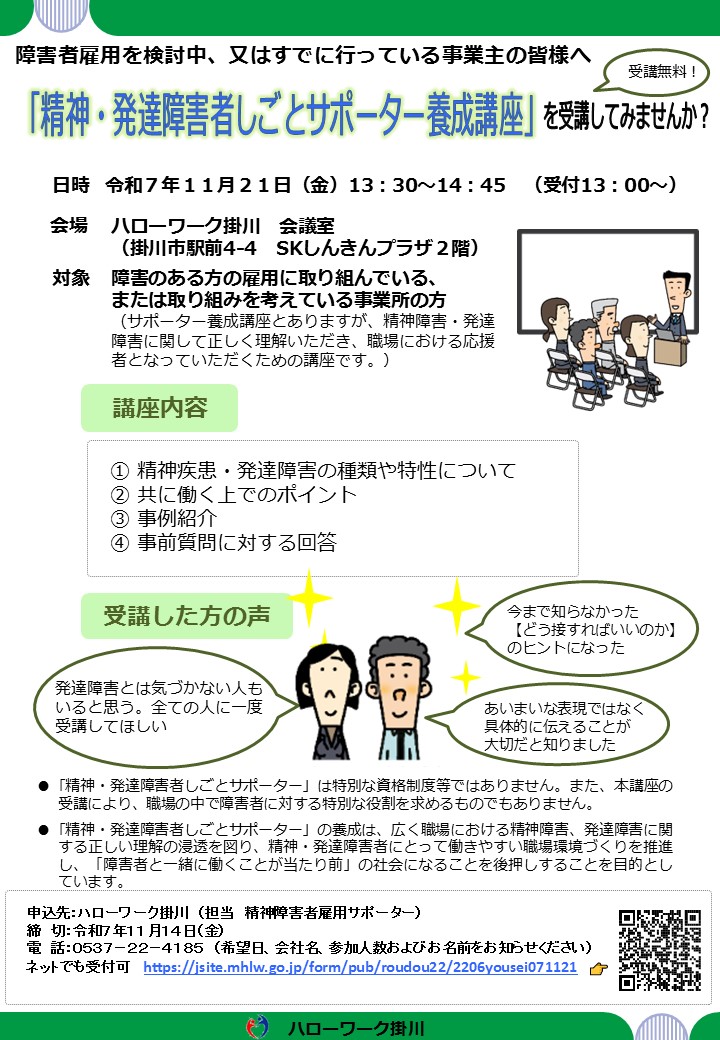 ★「精神・発達障害者しごとサポーター養成講座」の参加申込は、下記の申込フォームからお願いします。