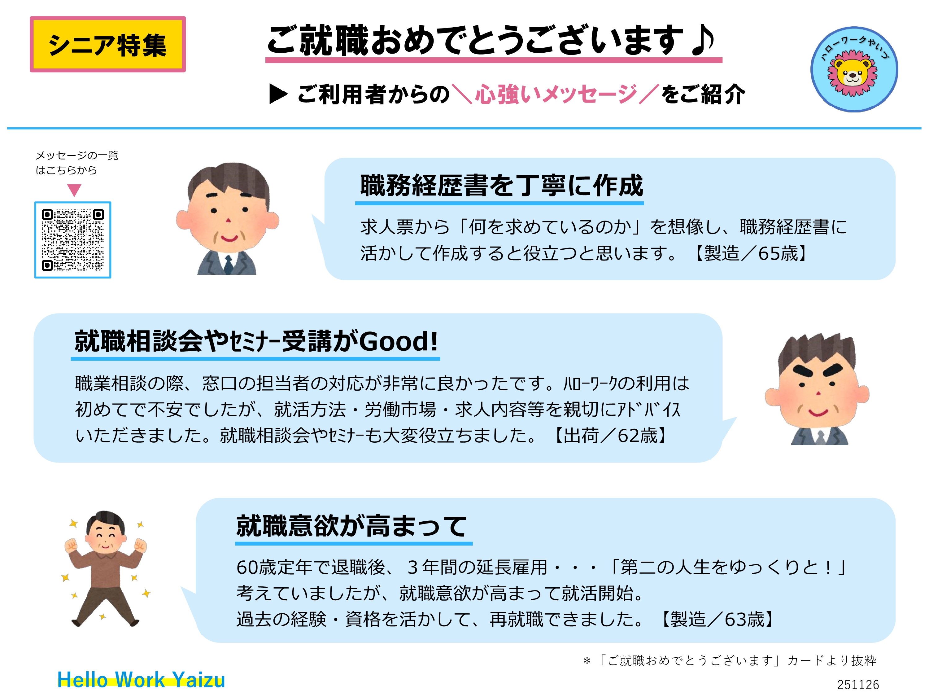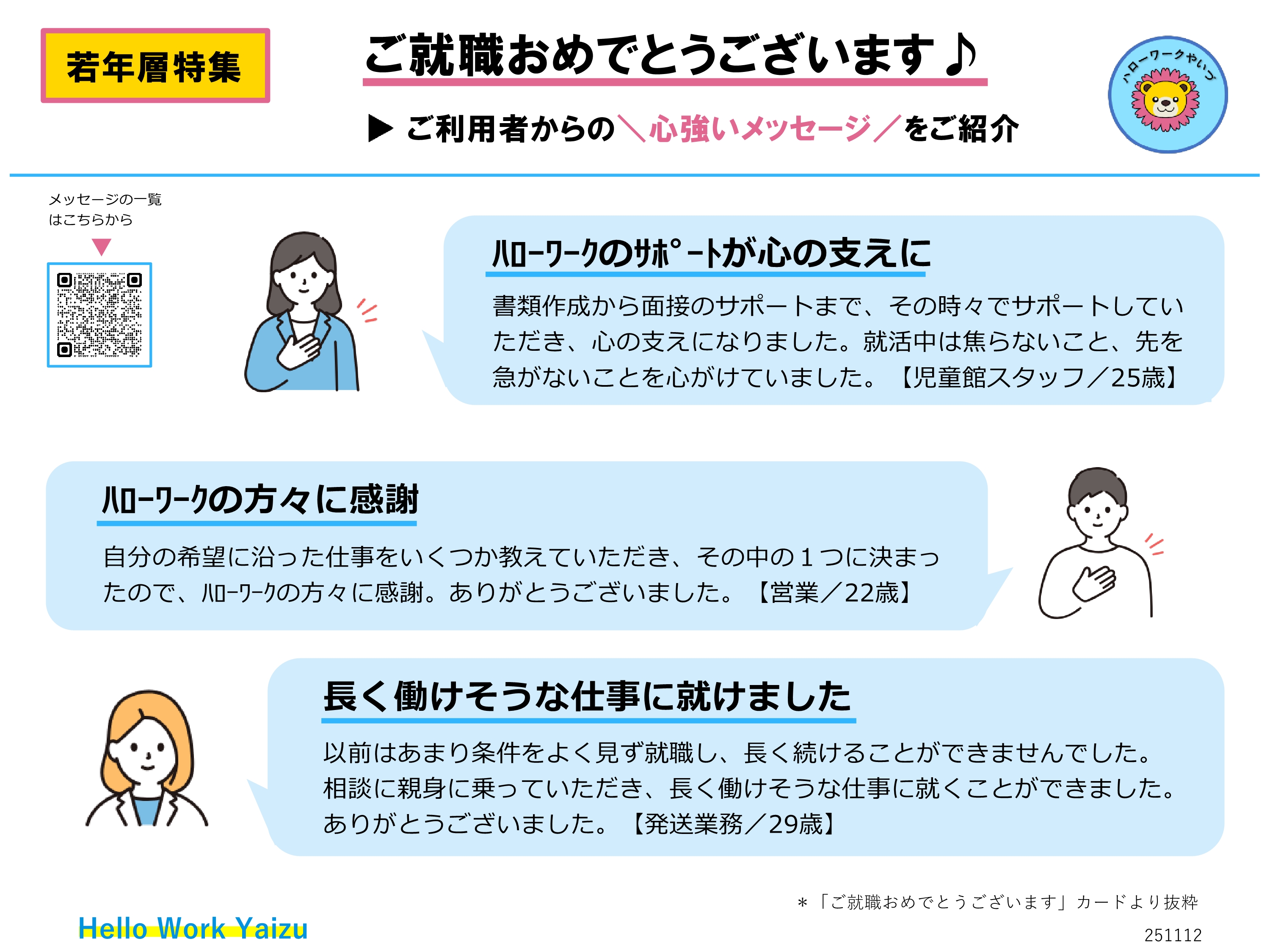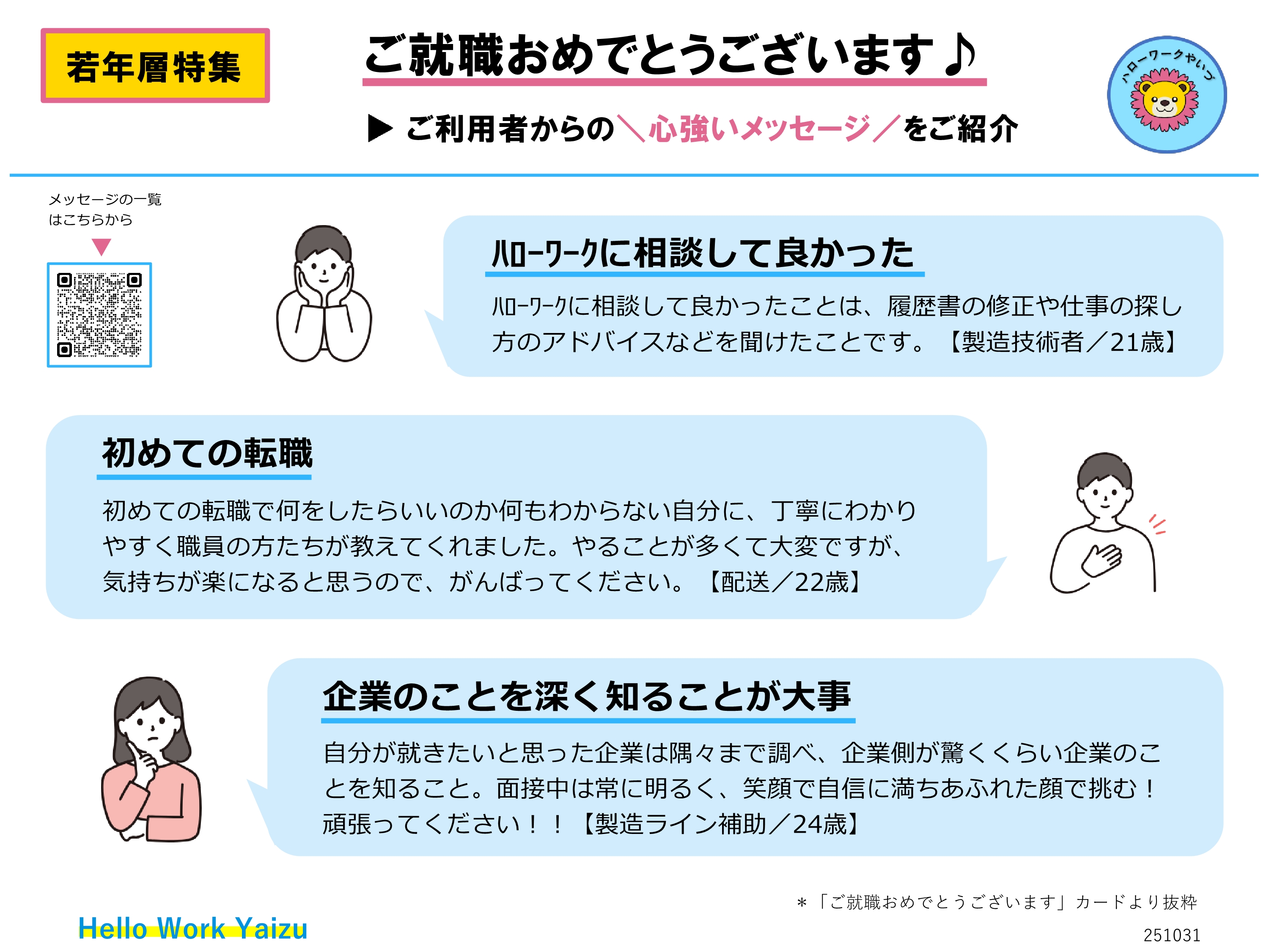 ハローワーク焼津を利用して就職された方々からの声をお届けします。 【令和7年5月】 【令和7年6月】 【令和7年7月】 【令和7年8月】 【令和7年9月】 【令和7年10月】 【令和7年11月】