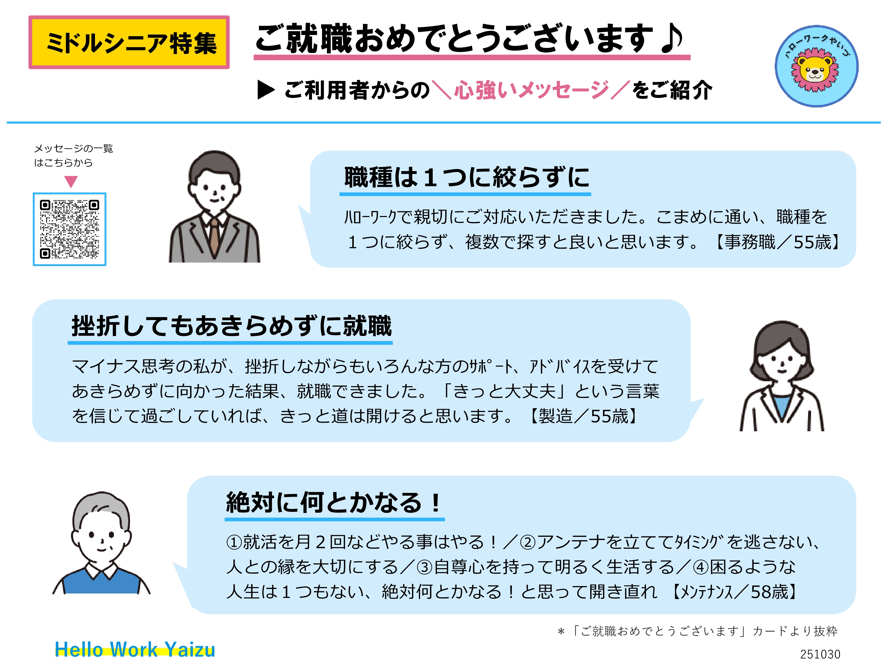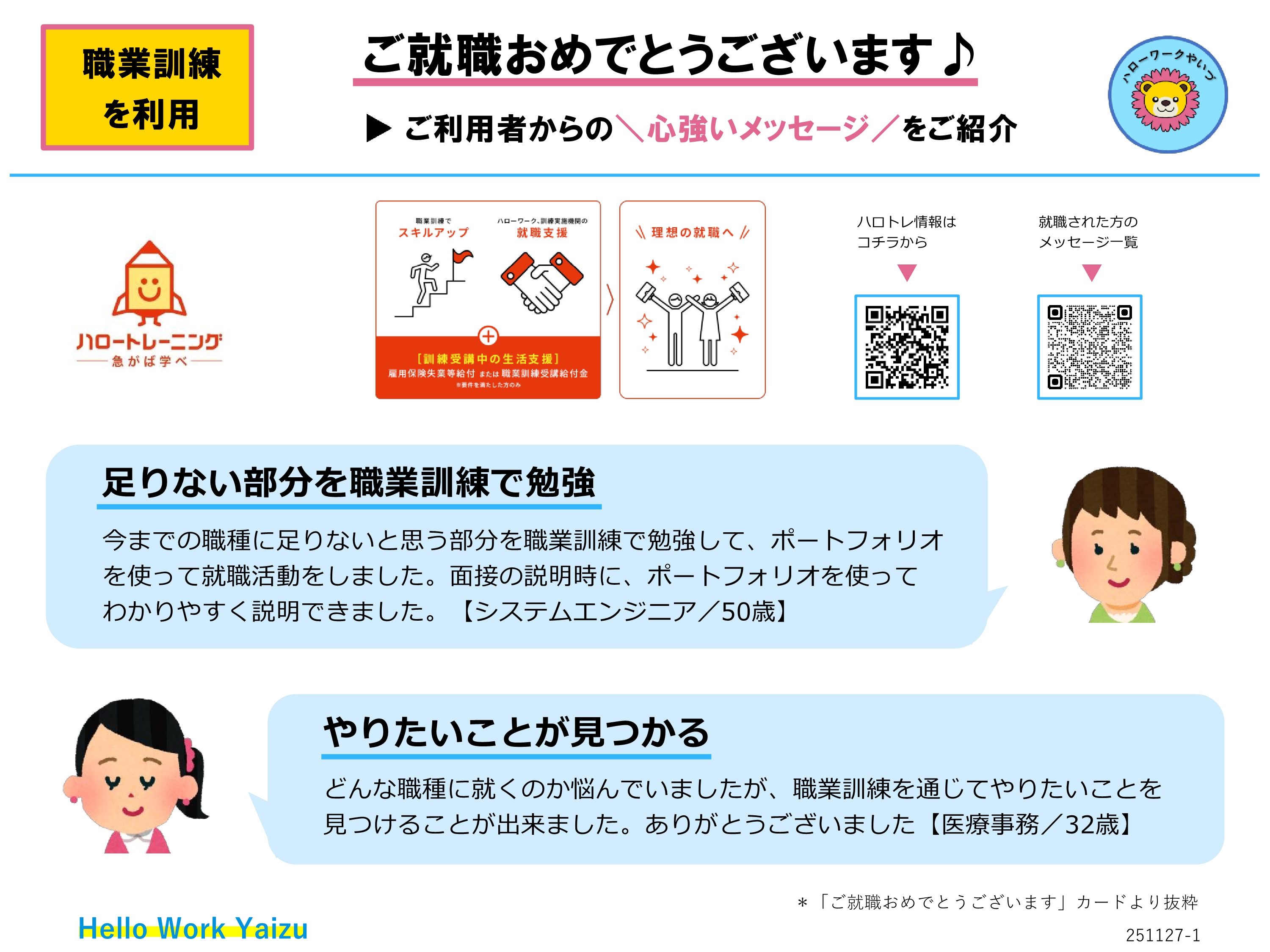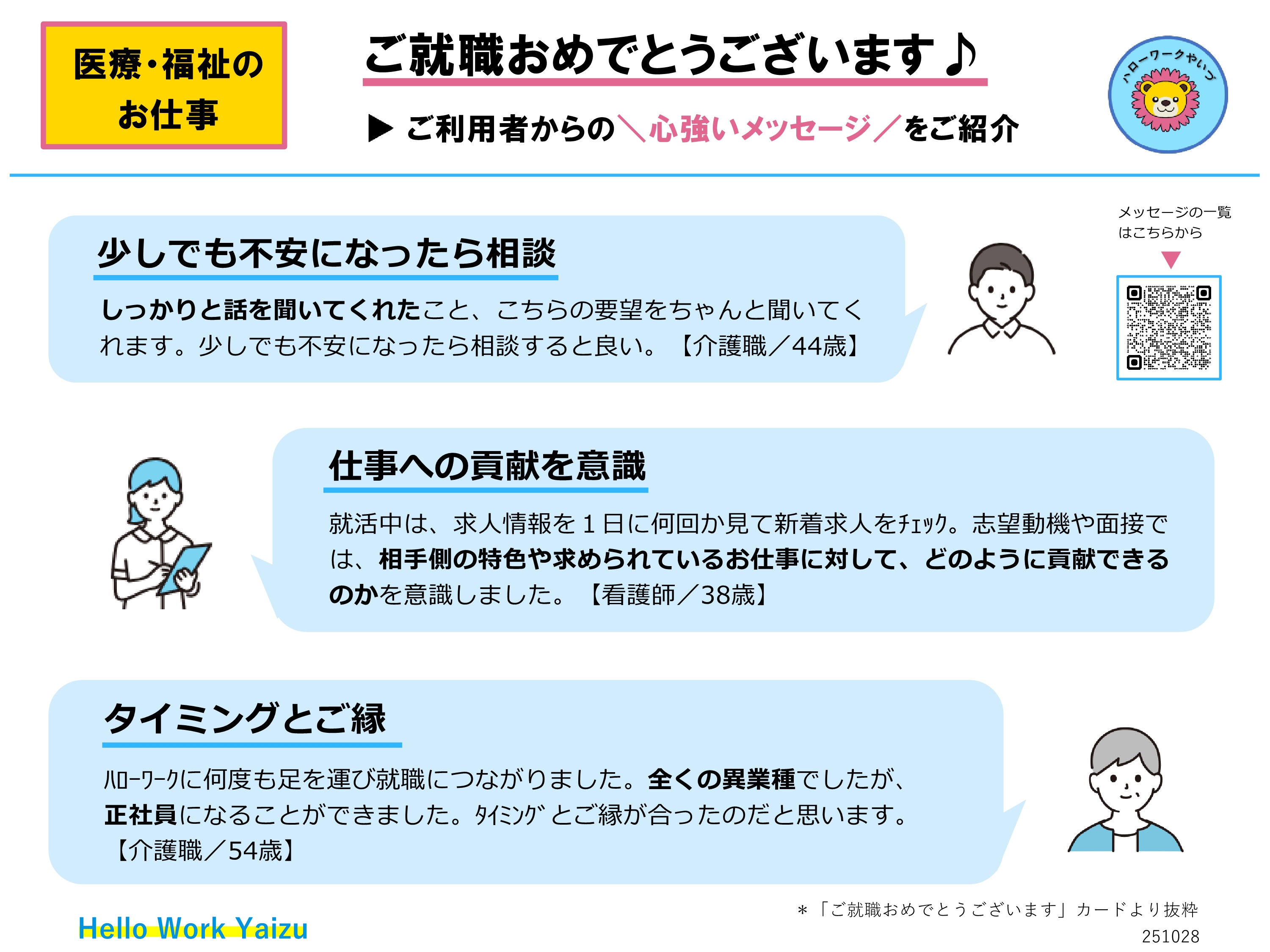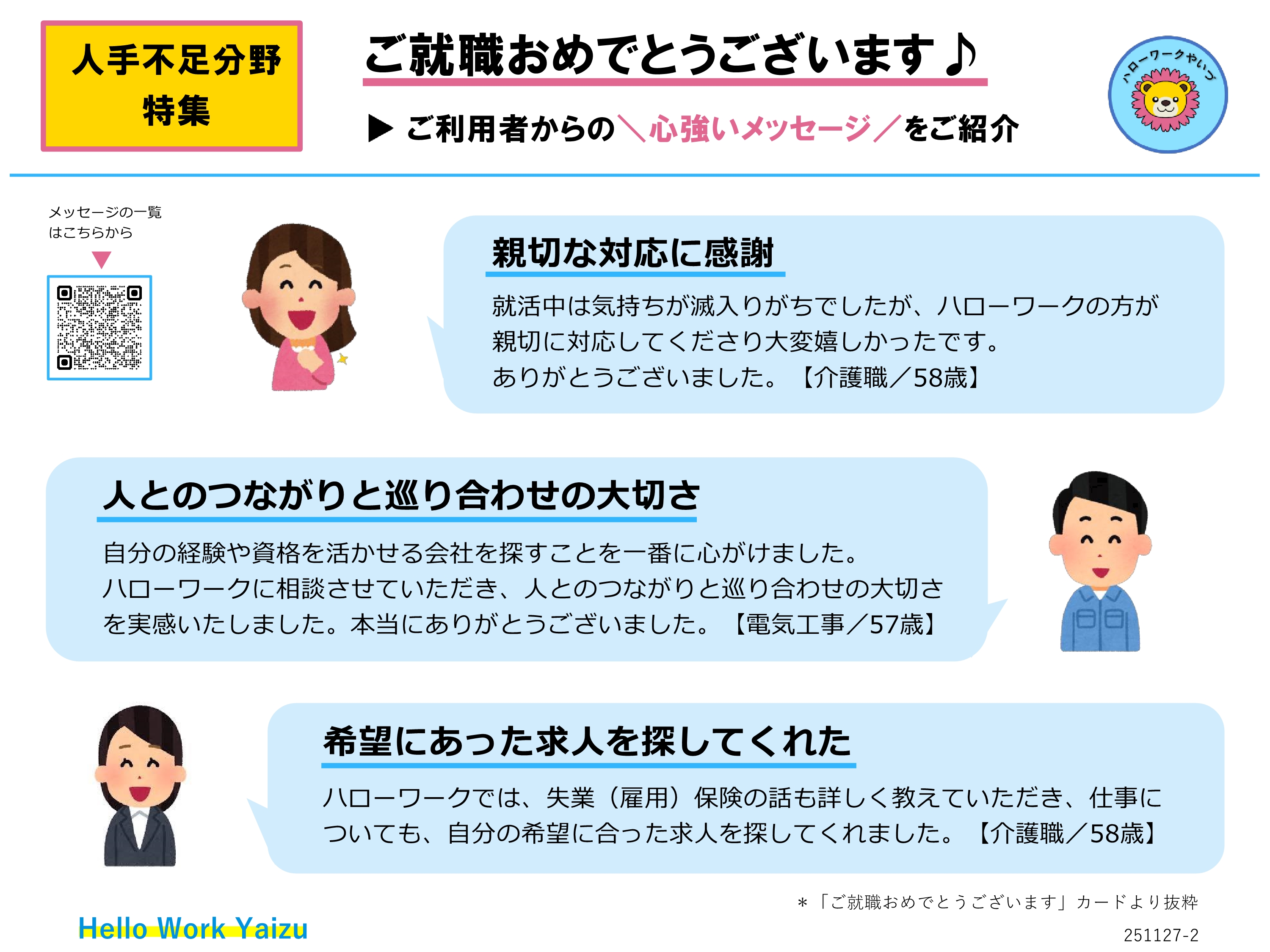ハローワーク焼津を利用して就職された方々からの声をお届けします。 【令和7年5月】 【令和7年6月】 【令和7年7月】 【令和7年8月】 【令和7年9月】 【令和7年10月】 【令和7年11月】