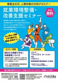 厚生労働省では、適正な労務管理や安全衛生管理など、就業環境の整備や見直しをご検討されている事業主の皆様に対し、専門家によるセミナーや個別訪問指導を委託事業により無料で実施しています。