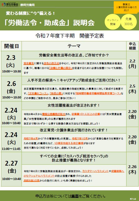 静岡労働局では、ビデオ会議ツール「Zoomウェビナー」を使用したオンライン形式により、労働法令や助成金に関する説明会を開催します。