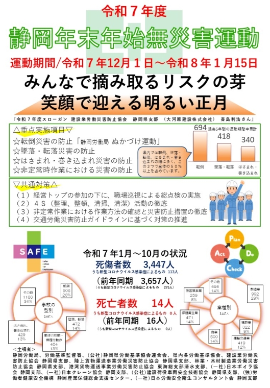 静岡労働局では、「静岡年末年始無災害運動」を県下一斉に展開し、年末年始の労働災害の撲滅に向けた取組強化を呼び掛けるため、安全パトロール等を実施します。