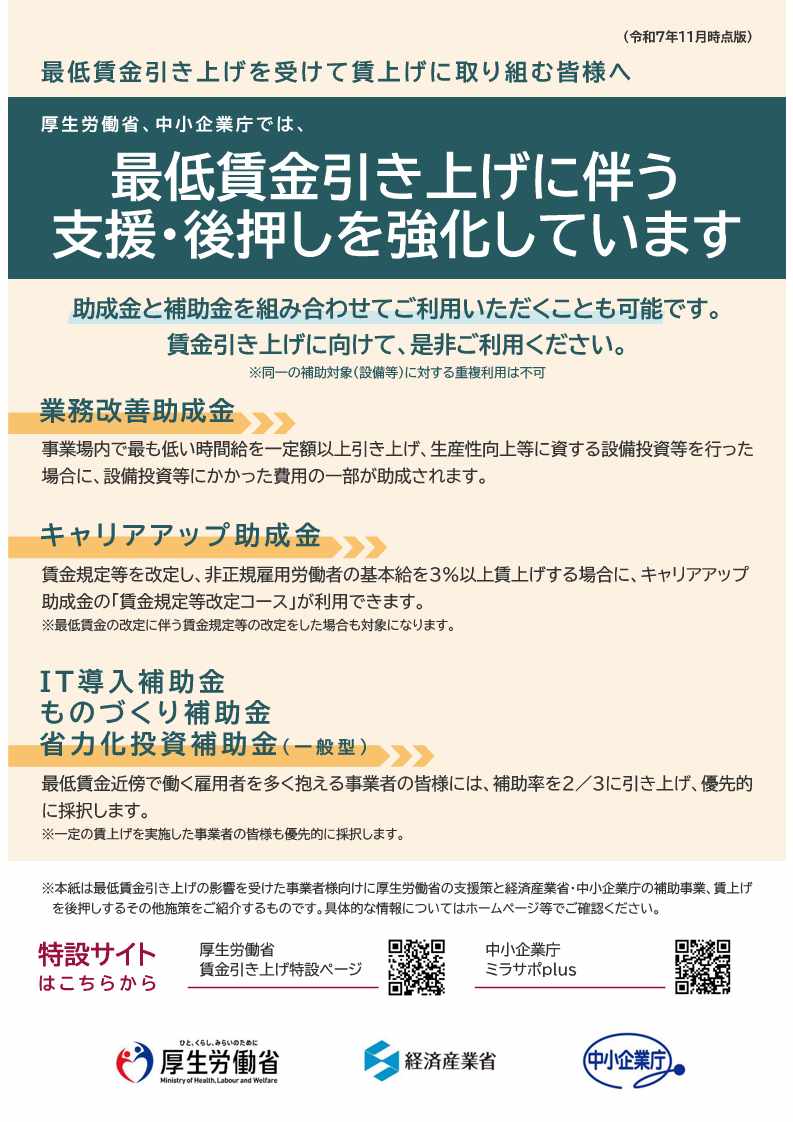 ![]() 最低賃金・賃金引上げに向けた中小企業・小規模事業者への支援施策【R7.11】(PDF) |