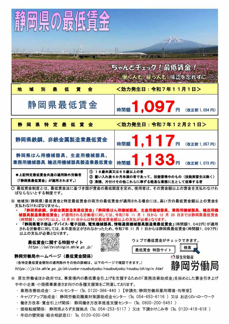 | ※ この改正に伴い、上記の特定最低賃金が適用される労働者については、令和7年12月20日までは静岡県最低賃金(時間額1,097円)以上、12月21日からは改正された特定最低賃金額以上の支払が必要となります。 ※ 「静岡県電子部品・デバイス・電子回路、電気機械器具、情報通信機械器具製造業」(時間額1,042円)が適用される労働者については、本年度、改正がされなかったため、令和7年11月1日からは静岡県最低賃金(1,097円)以上の支払が必要となります。 |