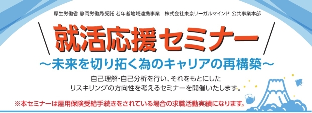 | 就活応援セミナー | ○就活応援セミナー~未来を切り拓くためのキャリアの再構築~ 自己理解・自己分析を行い、それをもとにしたリスキリングの方向性を考えるセミナーです。 1 日時 ①ハローワーク静岡:12月2日(火) ②ハローワーク浜松:12月16日(火) ③ハローワーク掛川:12月23日(火) ④ハローワーク清水:12月24日(水) ⑤ハローワーク磐田:1月13日(火) ⑥藤枝市産学官連携推進センター(BiVi藤枝):1月20日(火) ⑦ハローワーク沼津:1月30日(金) いずれの日程も10:30~12:00(受付は10:20から) 詳細(チラシ) 2 参加対象者 学生及びおおむね45歳未満の求職者(各回先着15名) 3 申込方法 こちらのホームページから(https://jakunen-shizuoka.mhlw.go.jp/shuukatsu/) 4 お問合せ先 若年者地域連携事業事務局(株式会社東京リーガルマインド(静岡労働局受託)) 電話番号:080-4457-9157 メール :shizuoka-jakunen@lec.co.jp |
