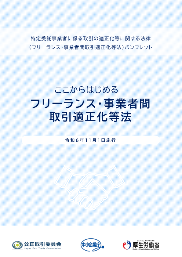 このような状況を改善し、個人が事業者として受託した業務に安定的に従事できる環境を整備するため、「特定受託事業者に係る取引の適正化等に関する法律(フリーランス・事業者間取引適正化等法)」が令和6年11月1日に施行されました。
