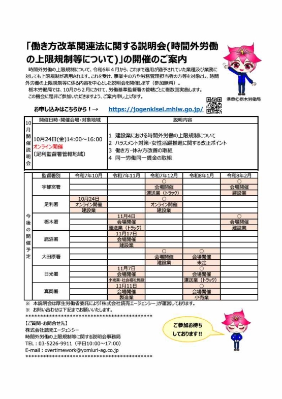 つきましては、事業主の方や労務管理担当者の方等を対象とし、時間外労働の上限規制等に係る内容を中心とした説明会を開催します。栃木労働局では、10月から2月にかけて、労働基準監督署の管轄ごとに複数回実施しますので、この機会に是非ともご参加いただきますよう、ご案内申し上げます(参加無料)。