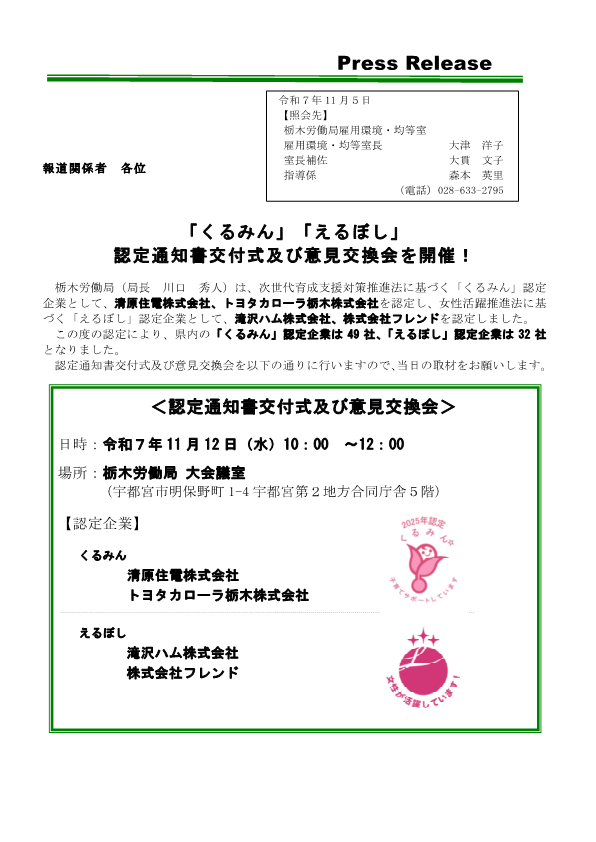 ~「くるみん」認定企業は49社、「えるぼし」認定企業は32社 ~