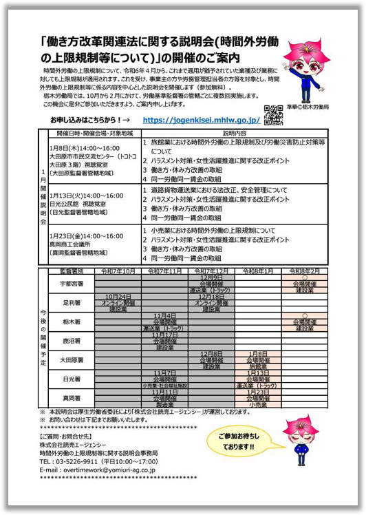 つきましては、事業主の方や労務管理担当者の方等を対象とし、時間外労働の上限規制等に係る内容を中心とした説明会を開催します。栃木労働局では、10月から2月にかけて、労働基準監督署の管轄ごとに複数回実施しますので、この機会に是非ともご参加いただきますよう、ご案内申し上げます(参加無料)。