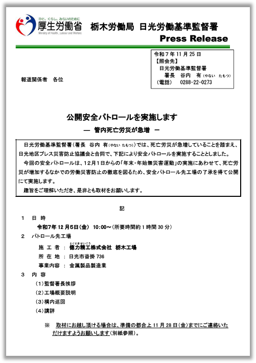 - 公開安全パトロールを実施します ―管内死亡労災が急増―