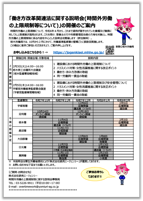 つきましては、事業主の方や労務管理担当者の方等を対象とし、時間外労働の上限規制等に係る内容を中心とした説明会を開催します。栃木労働局では、10月から2月にかけて、労働基準監督署の管轄ごとに複数回実施しますので、この機会に是非ともご参加いただきますよう、ご案内申し上げます(参加無料)。