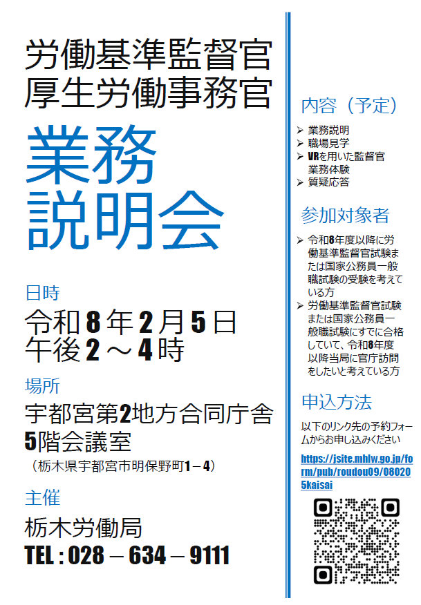 栃木労働局では、次年度以降の労働基準監督官試験、国家公務員一般職試験の受験を考えている方向けに業務説明会を開催します。