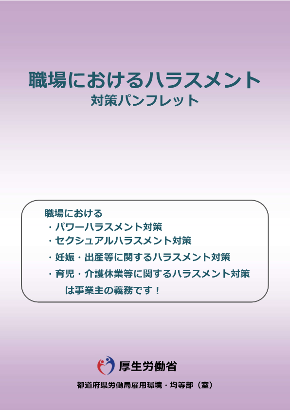 職場における ・パワーハラスメント対策 ・セクシュアルハラスメント対策 ・妊娠・出産等に関するハラスメント対策 ・育児・介護休業等に関するハラスメント対策 について掲載 ※カスハラ、就活セクハラ(令和8年10月1日施行)については、追って掲載予定。 |