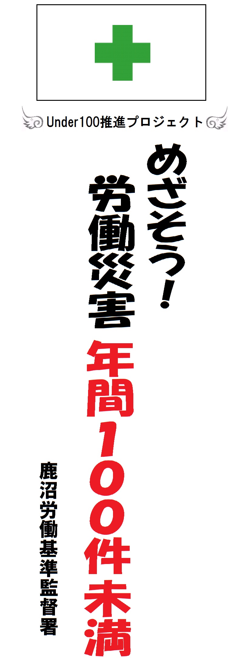 鹿沼労働基準監督署では、休業4日以上の労働災害件数を年間100件未満とすることを目標に、「Under100推進プロジェクト」に取り組んでいます。「めざそう! 労働災害年間100件未満」をスローガンに、労働基準監督署、労働災害防止団体、事業者がそれぞれの役割を果たすことで、労働災害の減少をめざします。
