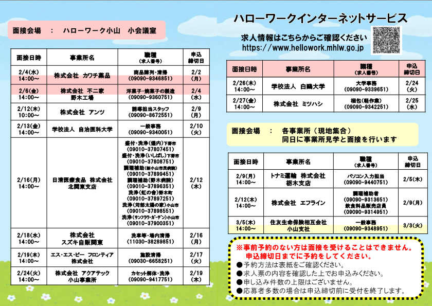 令和8年2月・3月 複数企業の面接会があります *事前申し込み制です。 *申込締め切りが個別にあります。 |