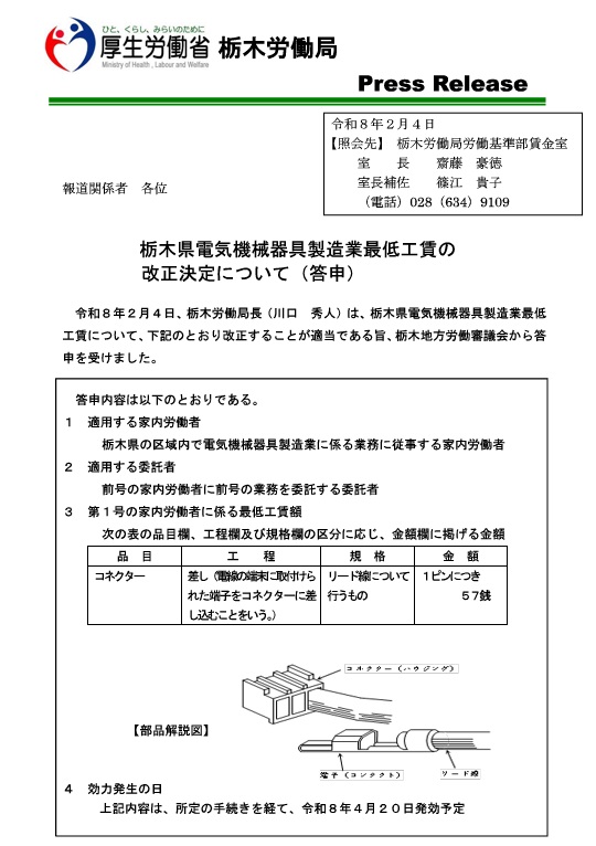 栃木県電気機械器具製造業最低工賃の改正決定について(答申)