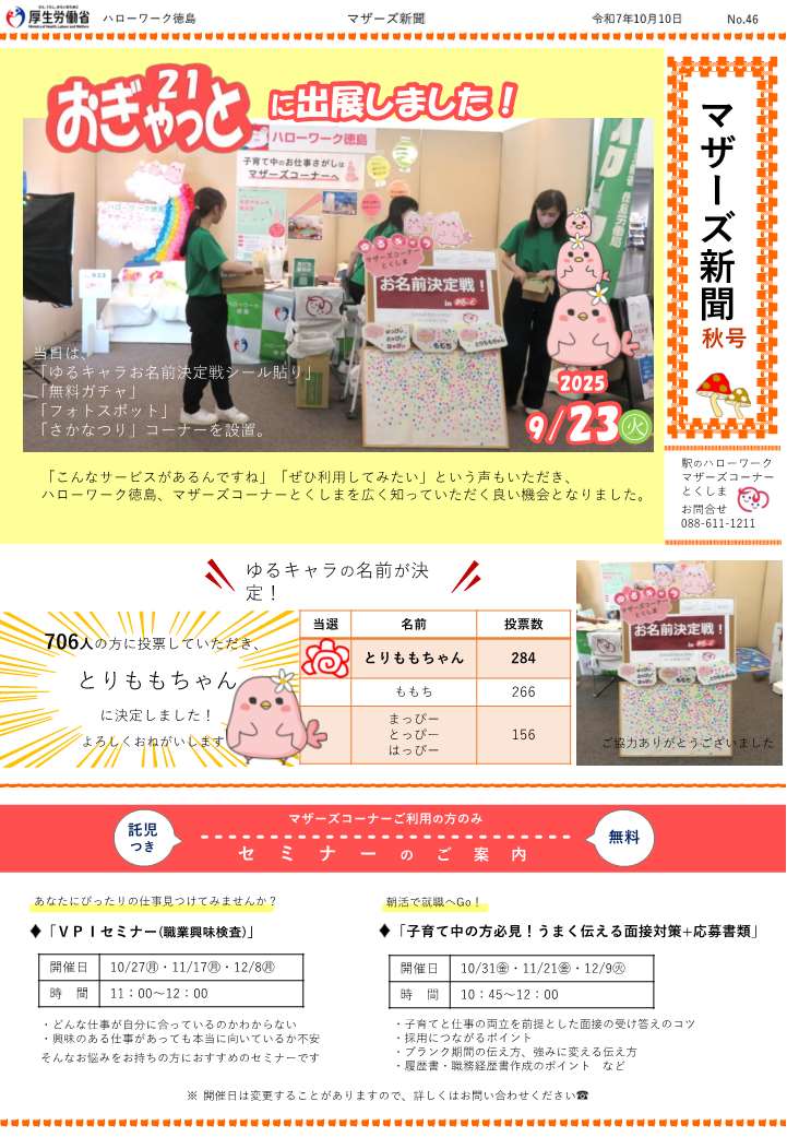 詳細はHP下段「マザーズコーナー オンライン職業相談」チラシをご覧ください。