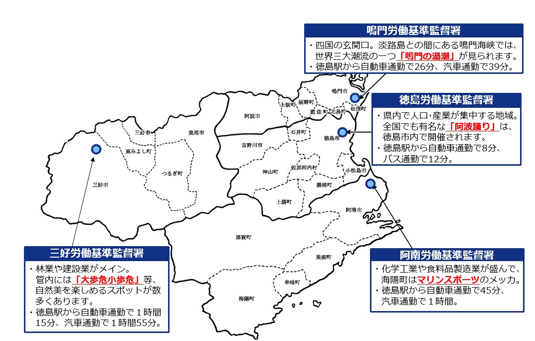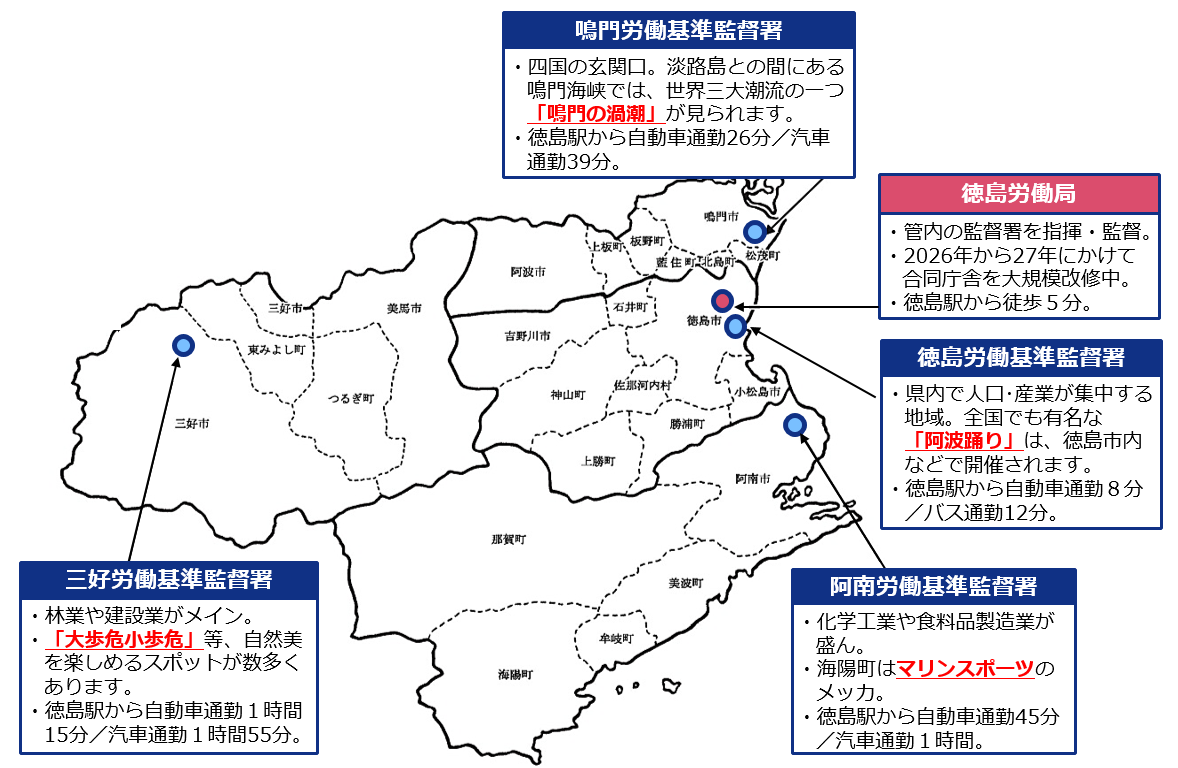 採用後は、原則として徳島労働局または同局管内の労働基準監督署で勤務します。
