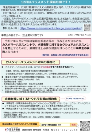 このため、厚生労働省ではハラスメントのない職場づくりを推進するため、年末に向けて業務の繁忙等によりハラスメントが発生しやすいと考えられる12月を「職場のハラスメント撲滅月間」と定め、ハラスメント防止の必要性及び法令に基づき必要となる取組についての周知を行うこととしています。令和7年6月11日に労働施施策総合推進法等の一部改正法が公布され、カスタマーハラスメントの防止措置が義務化されます!