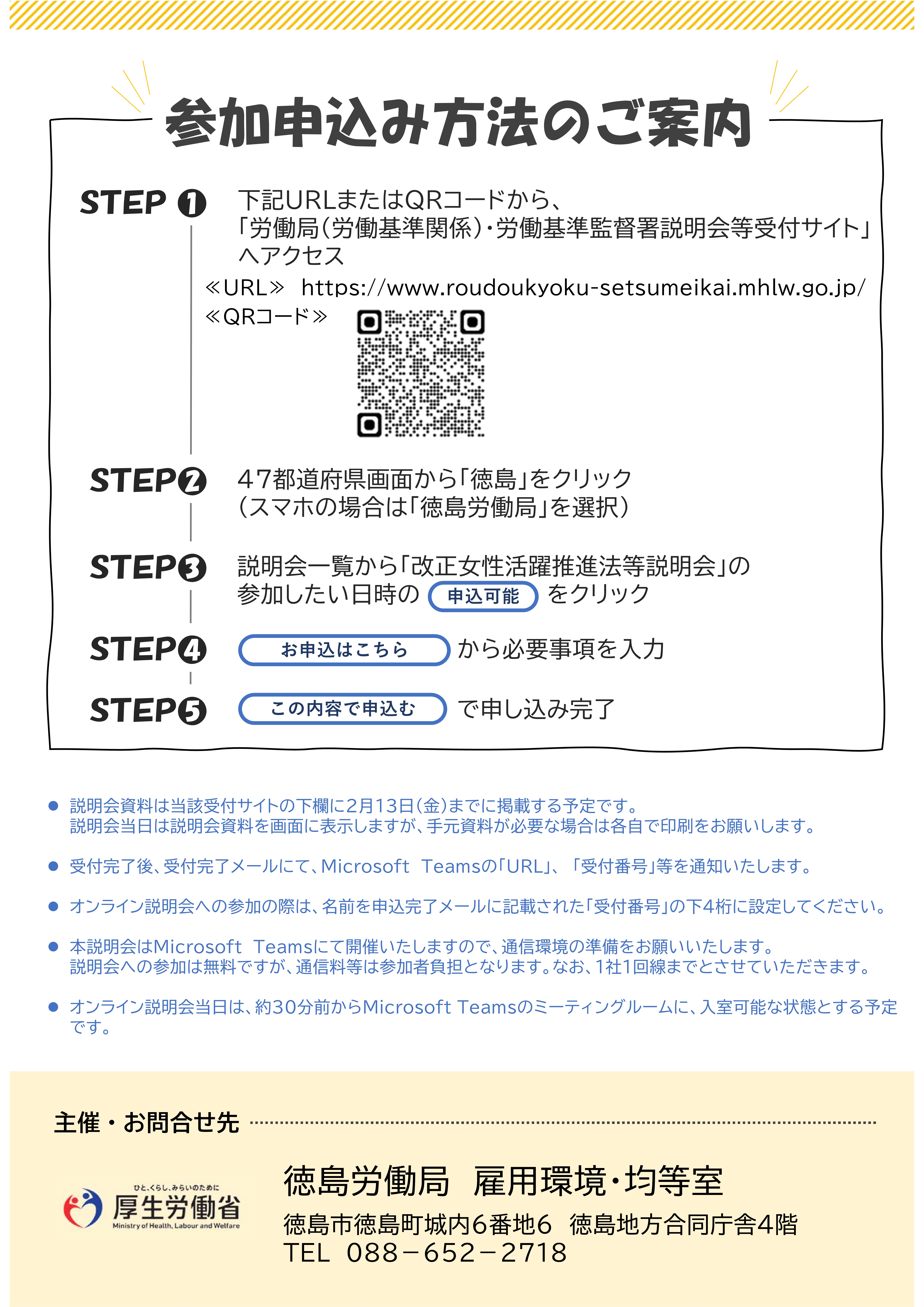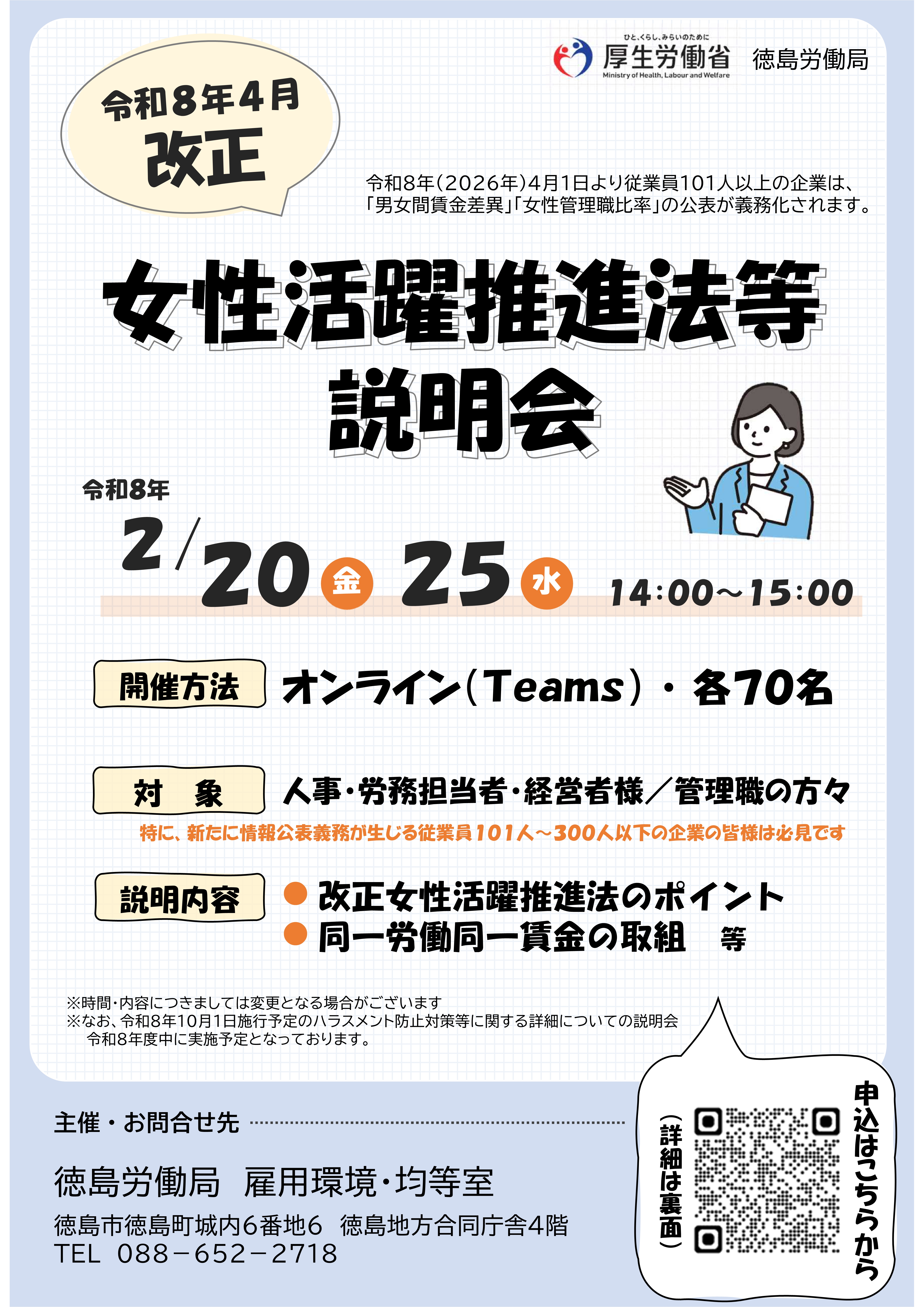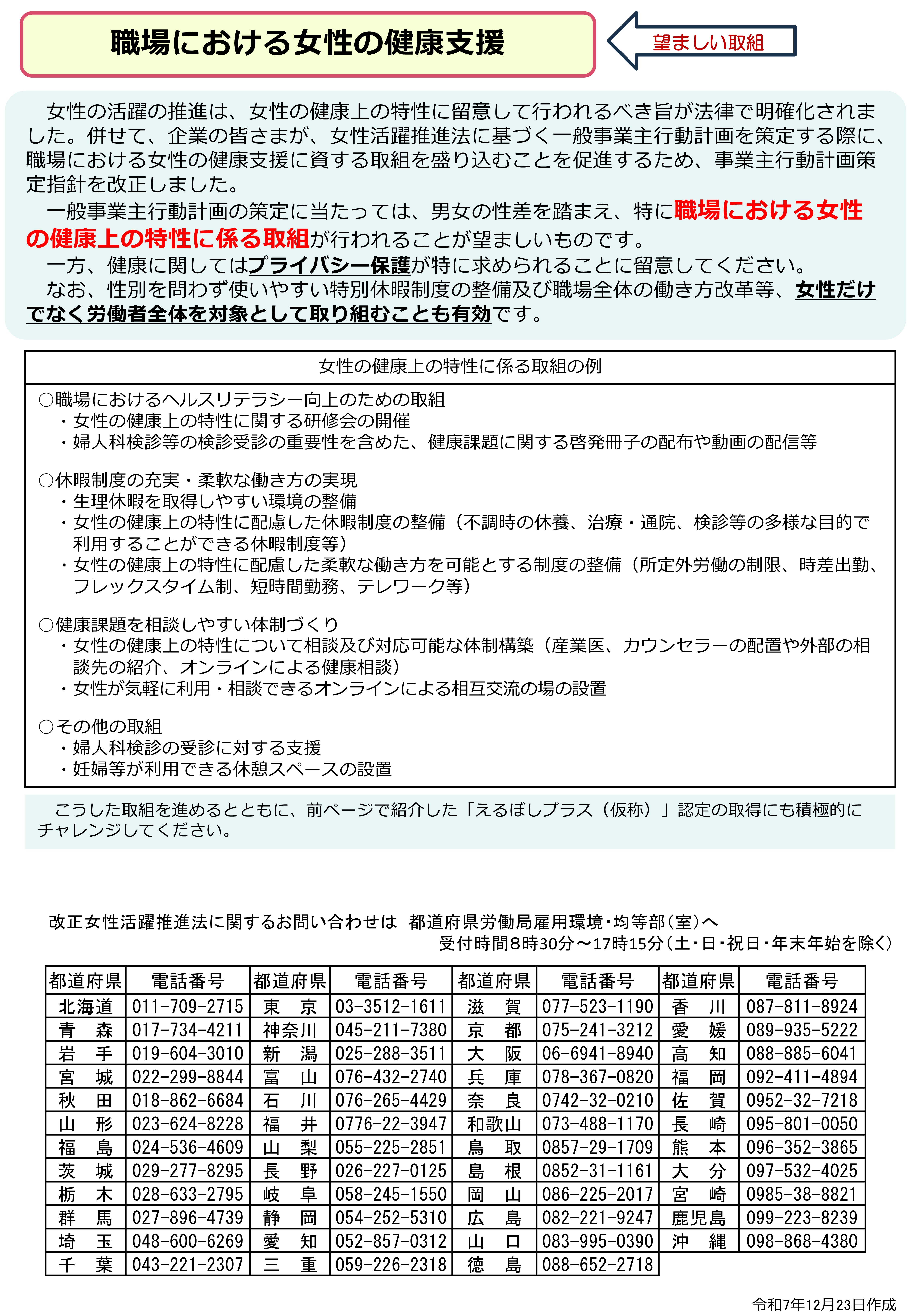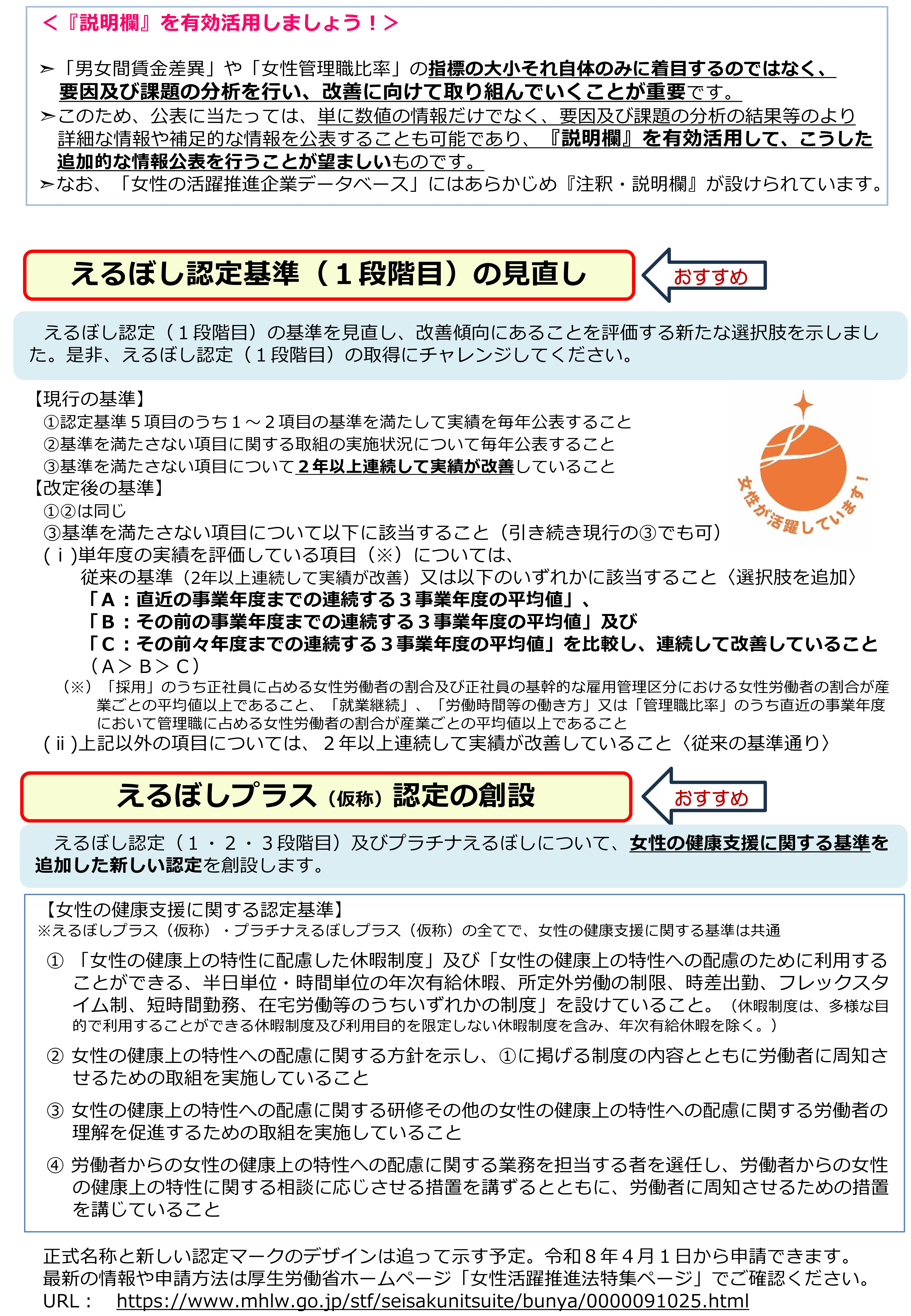 つきましては、改正内容について説明会(オンライン)を開催いたしますので、女性活躍推進法に基づく情報公表や一般事業主行動計画の策定に際し、改正法や改正省令・指針に沿った取組に向けて、ご参加くださいますようお願いいたします。
