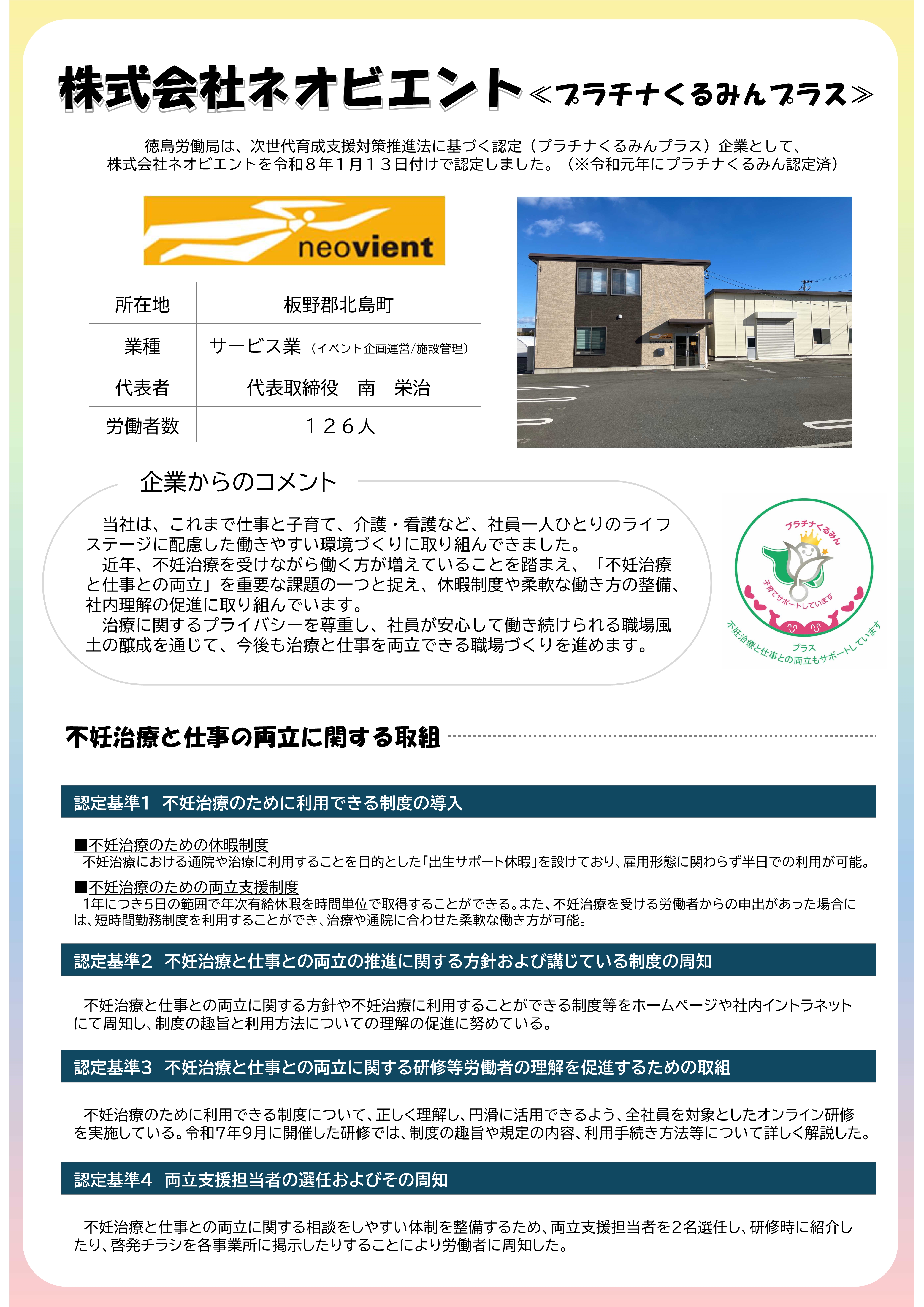 徳島労働局は、次世代育成支援対策推進法に基づく認定(通称:「プラチナくるみんプラス認定」)企業として、