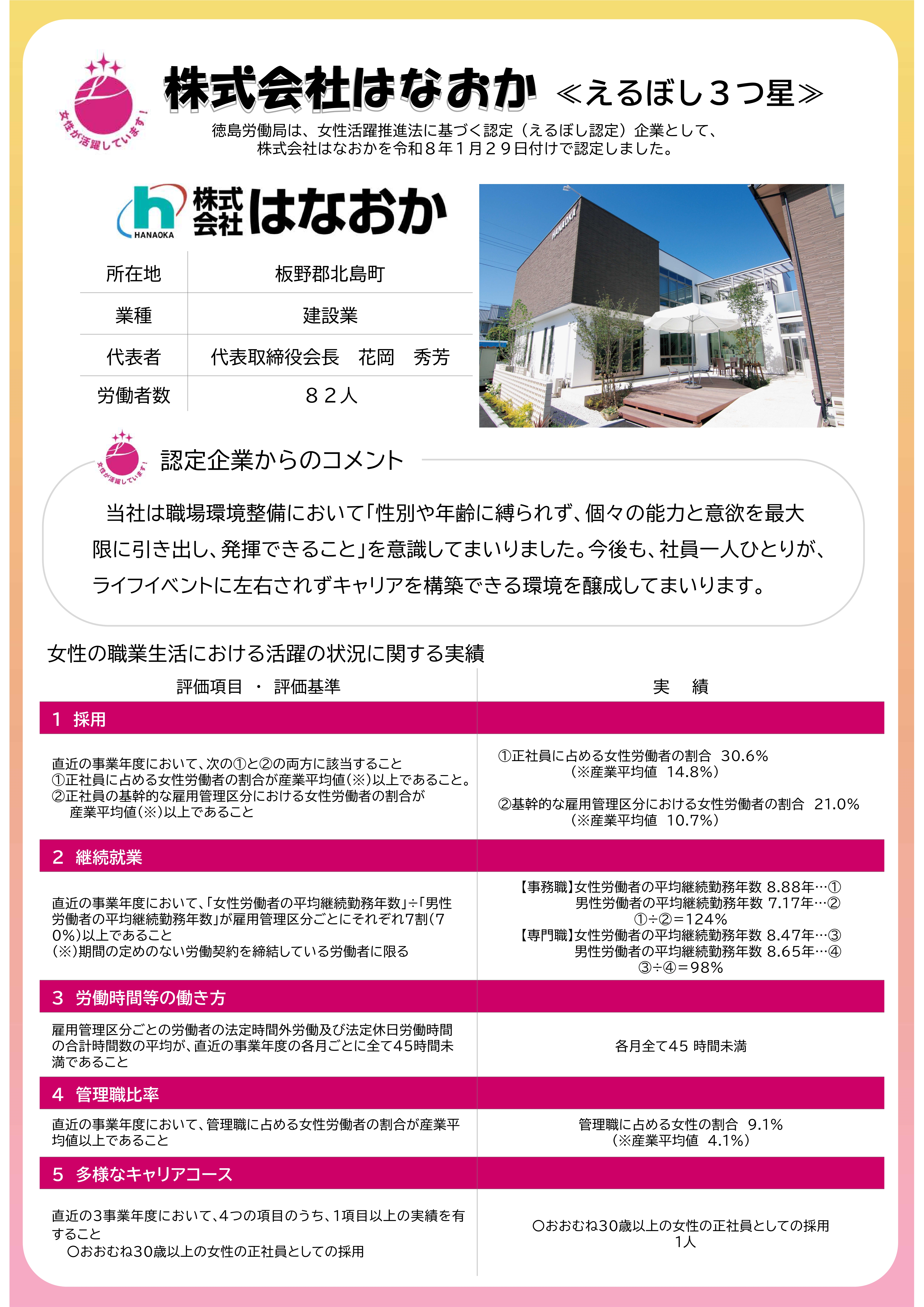 徳島労働局は、女性活躍推進法に基づく認定(通称:「えるぼし認定」)企業として、