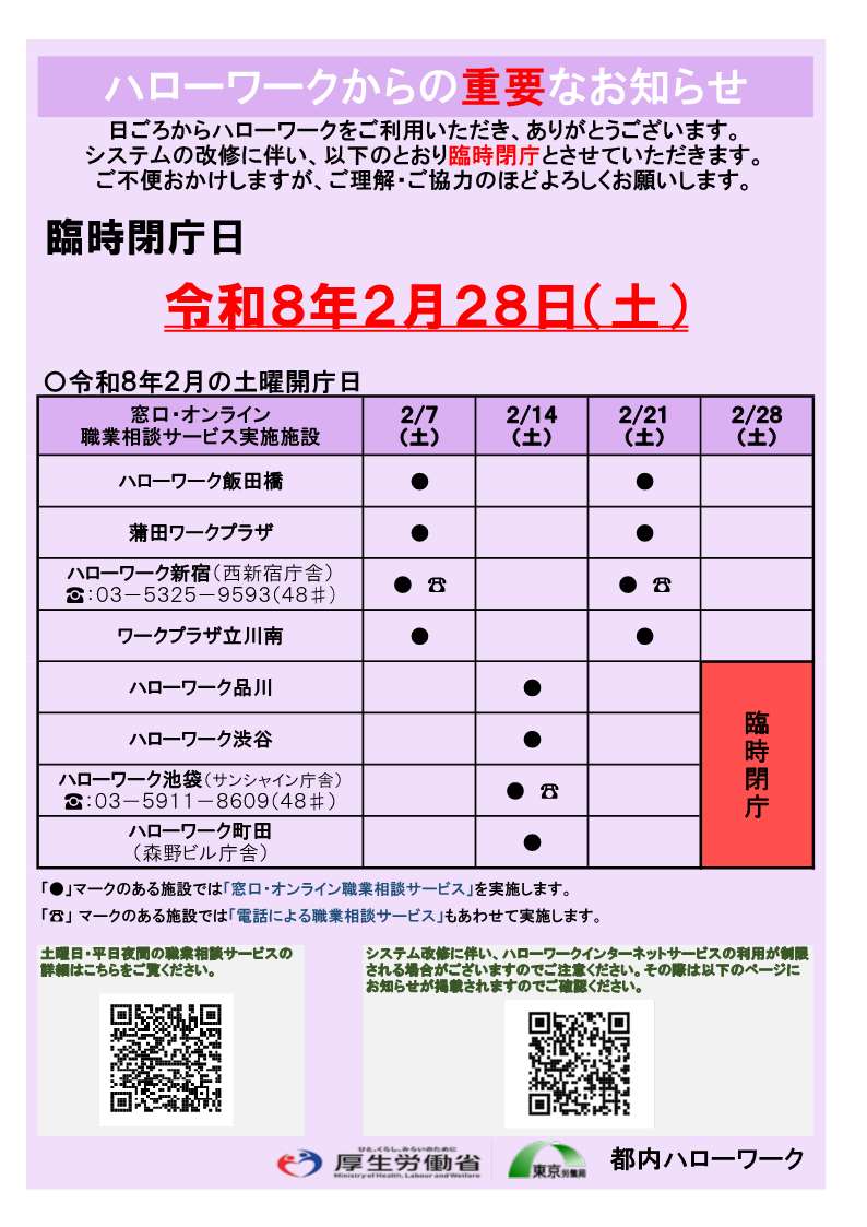 都内ハローワークの土曜開庁の臨時閉庁のご案内