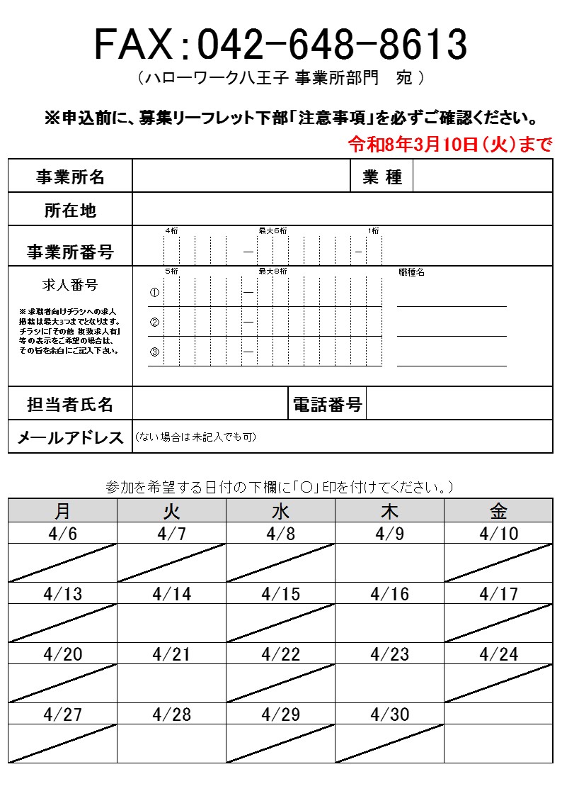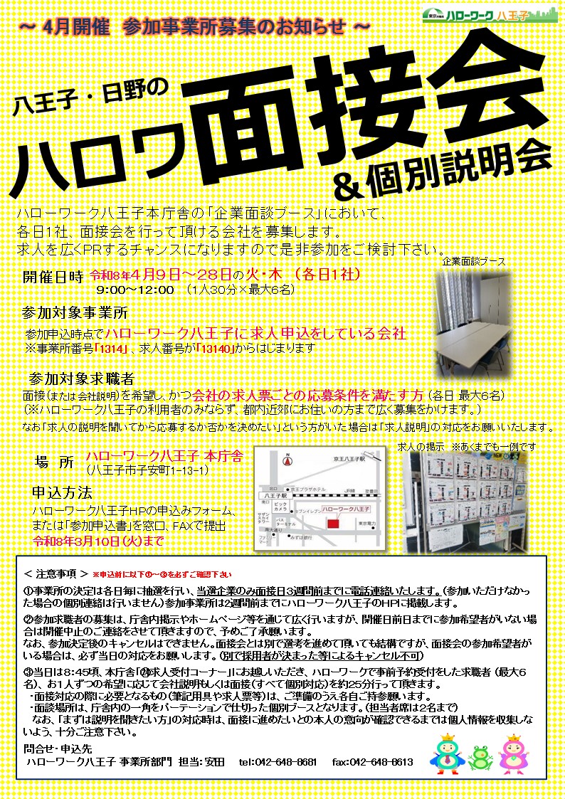 【参加企業募集】4月開催 八王子・日野のハロワ面接会&個別説明会