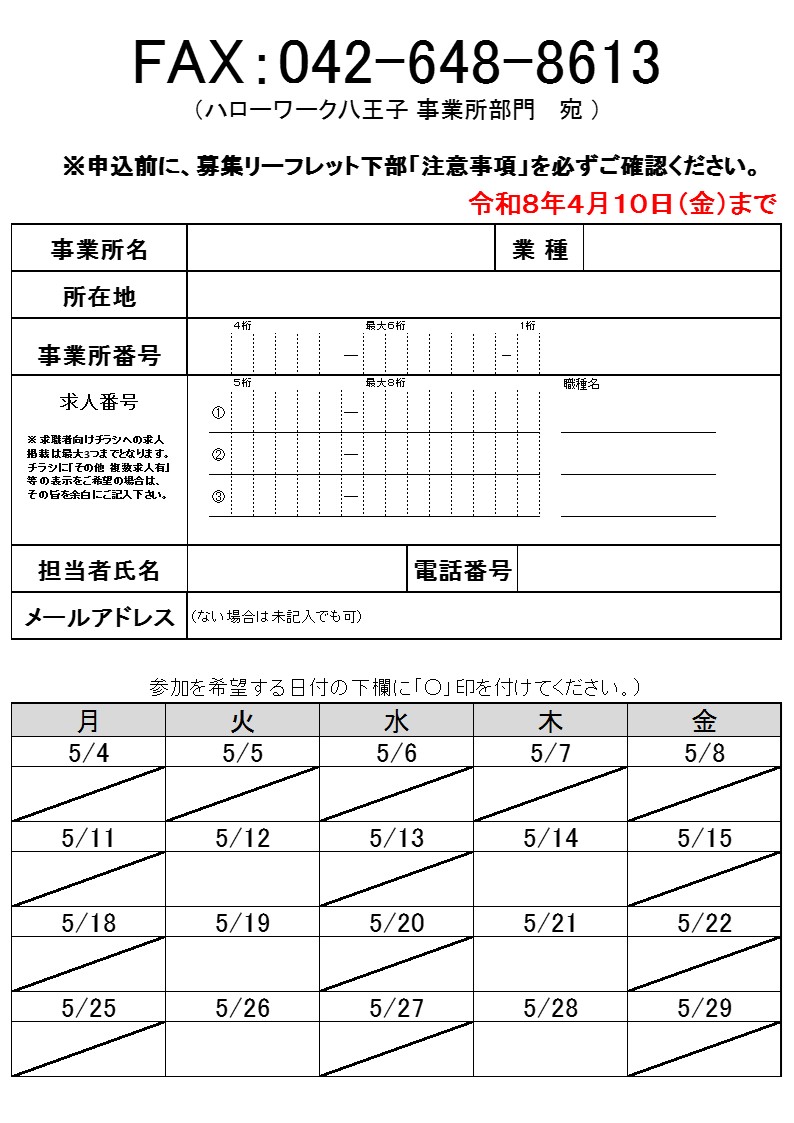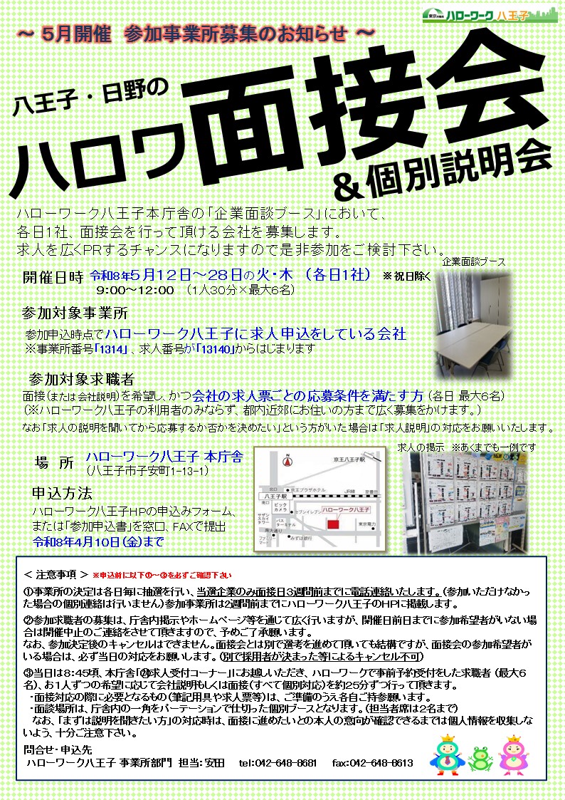 【参加企業募集】5月開催 八王子・日野のハロワ面接会&個別説明会