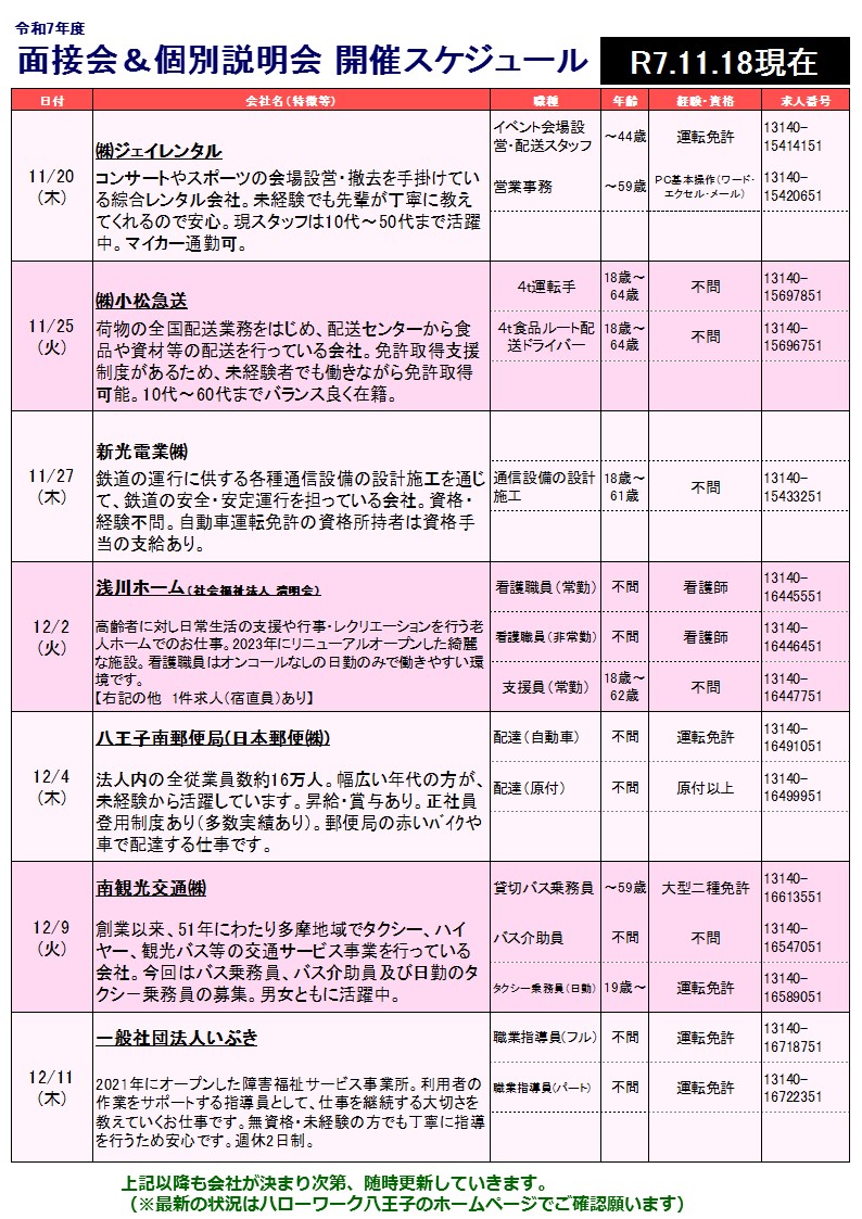 【11/20~12/11まで公開】八王子・日野のハロワ面接会&個別説明会(11/18更新)