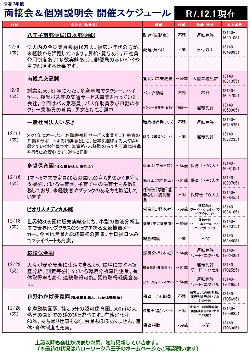 【12/4~12/25まで公開】八王子・日野のハロワ面接会&個別説明会(12/1更新)