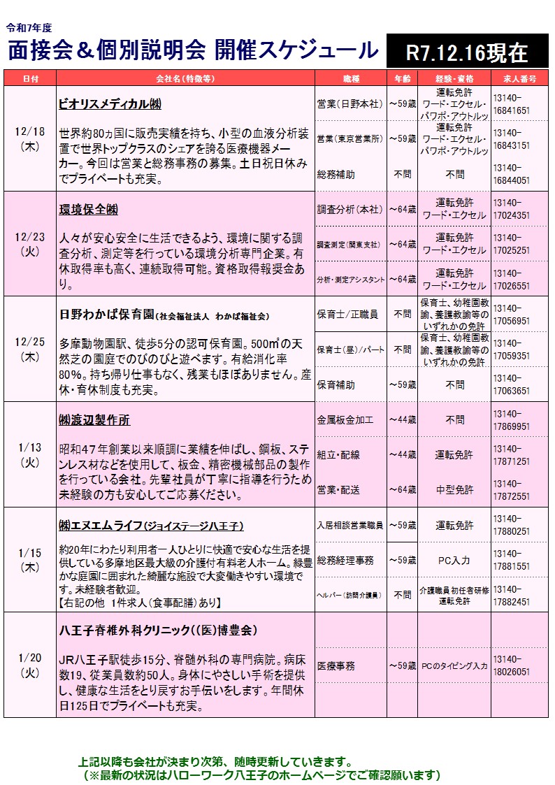 【12/18~1/20まで公開】八王子・日野のハロワ面接会&個別説明会(12/16更新)