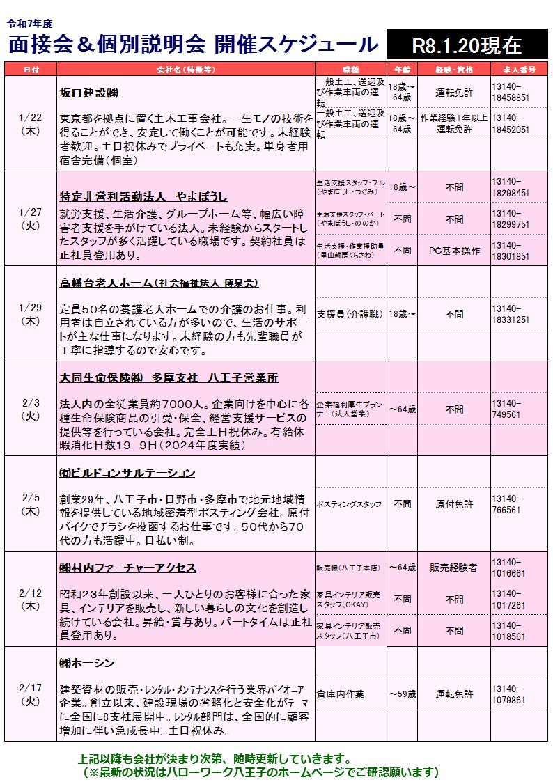 【1/22~2/17まで公開】八王子・日野のハロワ面接会&個別説明会(1/20現在)