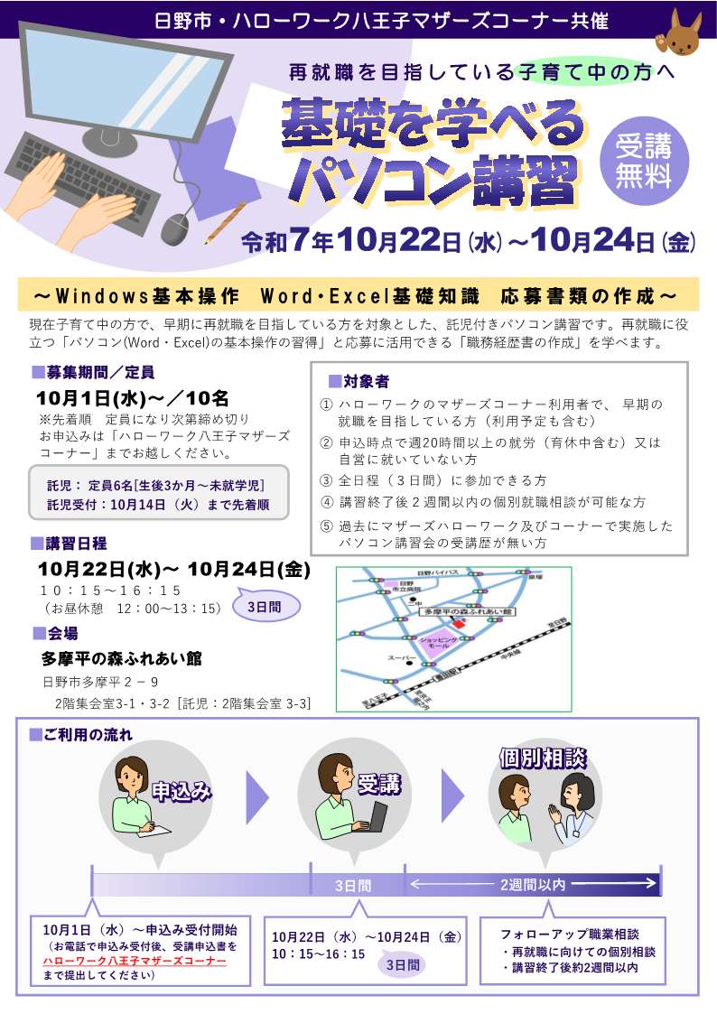 八王子しごと情報館マザーズコーナーでは、日野市との共催により、現在子育て中の方で、早期に再就職を目指している方を対象とした託児付きパソコン講習を開催します。