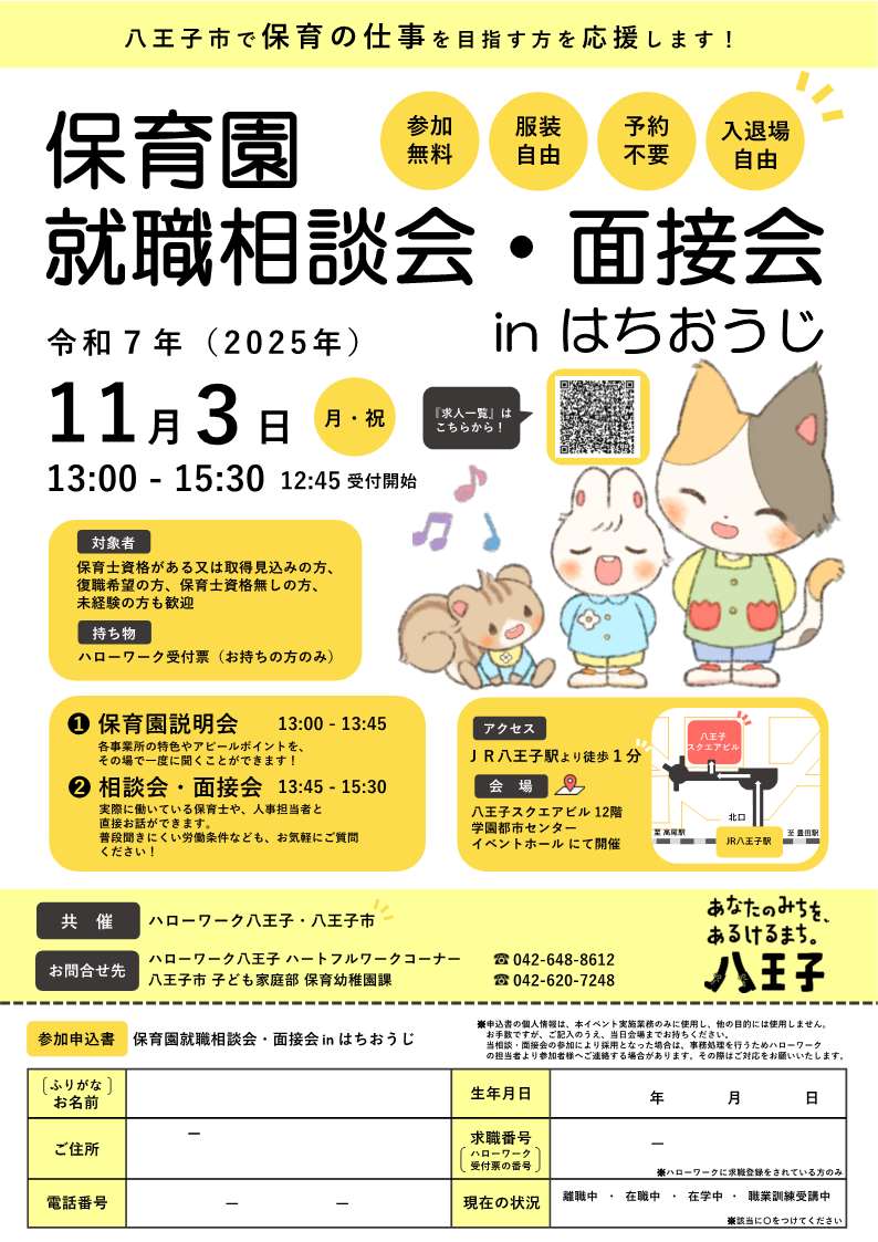 ハローワーク八王子では、八王子市との共催により「保育園 就職相談会・面接会inはちおうじ」を開催します。