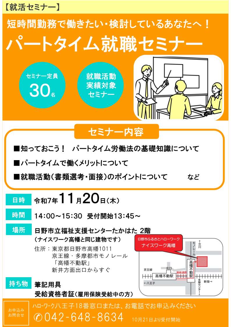 パートタイムで働くメリットや、就職活動の進め方などについてのセミナーとなっております。就職活動、再就職に向けぜひご参加ください。