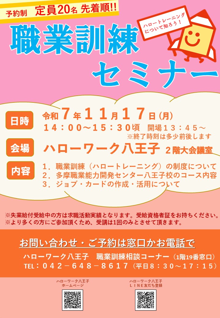 ハローワーク八王子では、再就職に必要な資格や知識・技能を修得するための「職業訓練」について、セミナーを開催いたします。