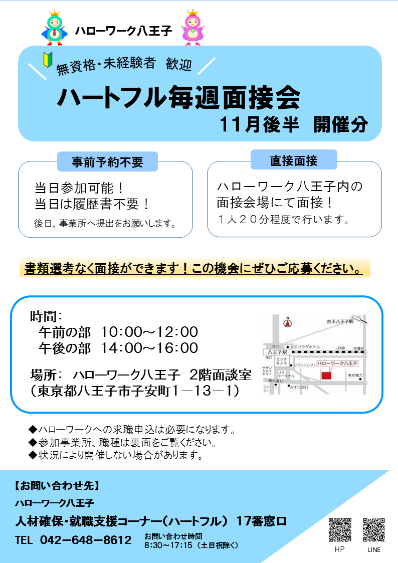 - ハローワーク八王子 2階面談室(八王子市子安町1-13-1)