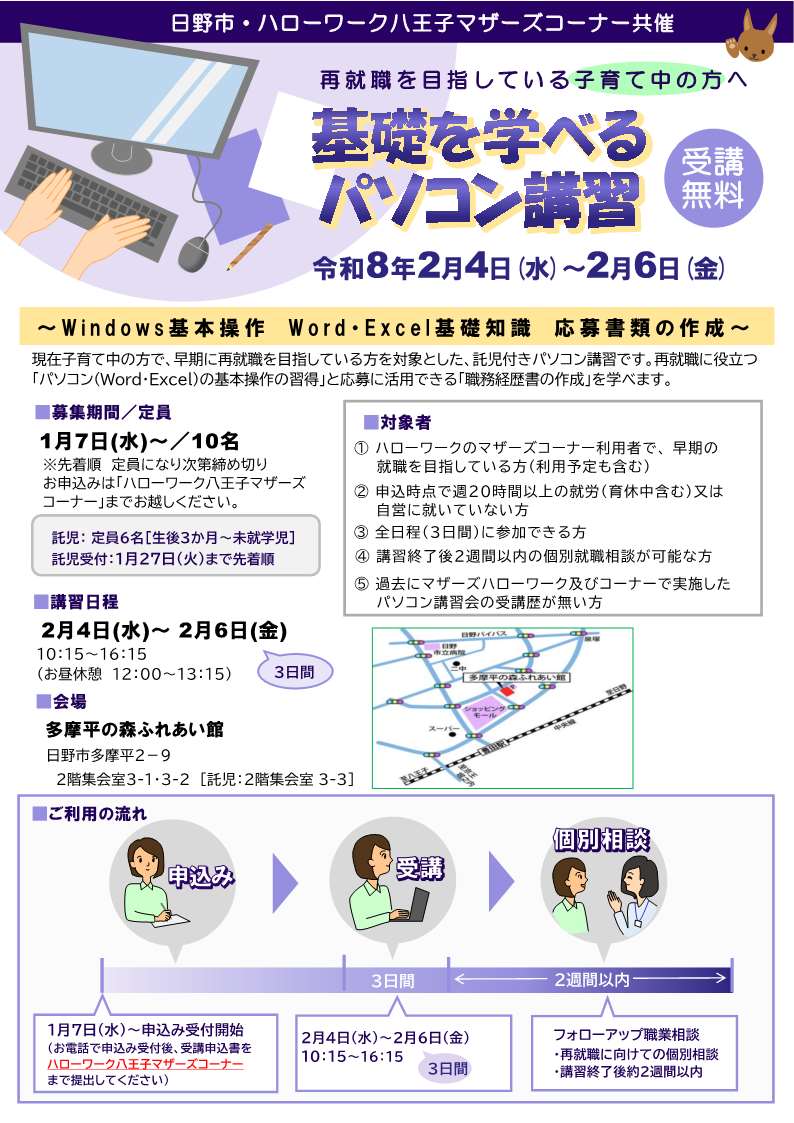 八王子しごと情報館マザーズコーナーでは、日野市との共催により、現在子育て中の方で、早期に再就職を目指している方を対象とした託児付きパソコン講習を開催します。