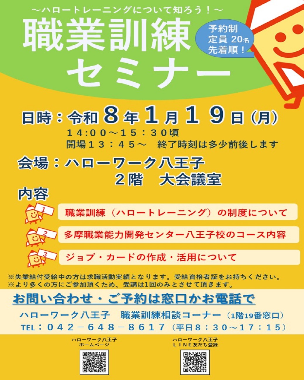 ハローワーク八王子では、再就職に必要な資格や知識・技能を修得するための「職業訓練」について、セミナーを開催いたします。