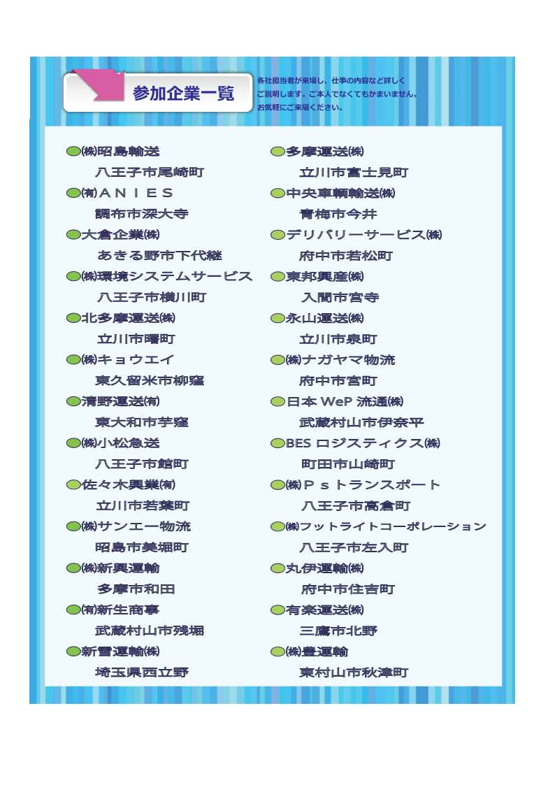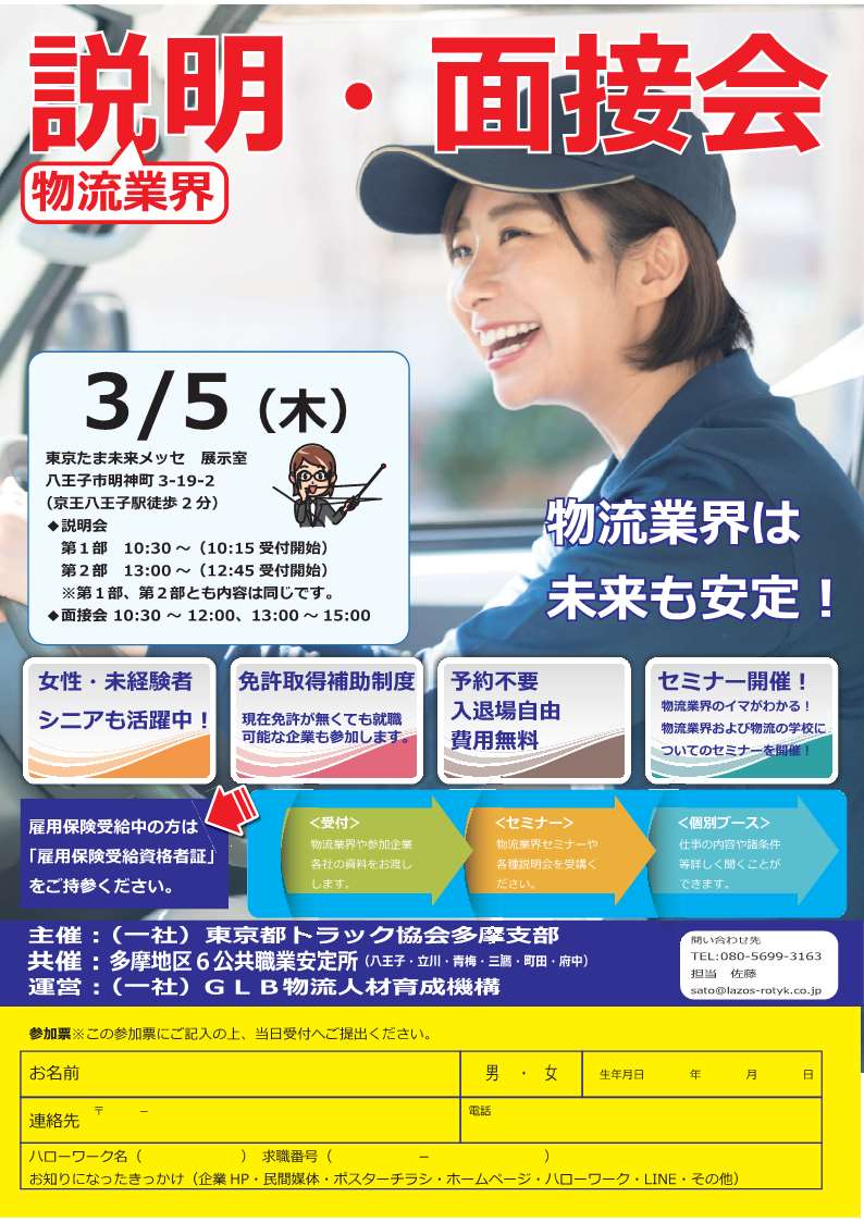多摩地区6公共職業安定所(八王子・立川・青梅・三鷹・町田・府中)では、(一社)東京都トラック協会多摩支部との共催により、【物流業界】説明・面接会 を開催いたします。