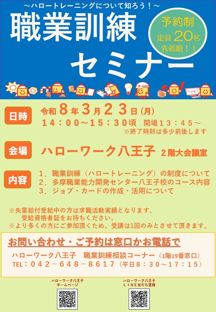 ハローワーク八王子では、再就職に必要な資格や知識・技能を修得するための「職業訓練」について、セミナーを開催いたします。