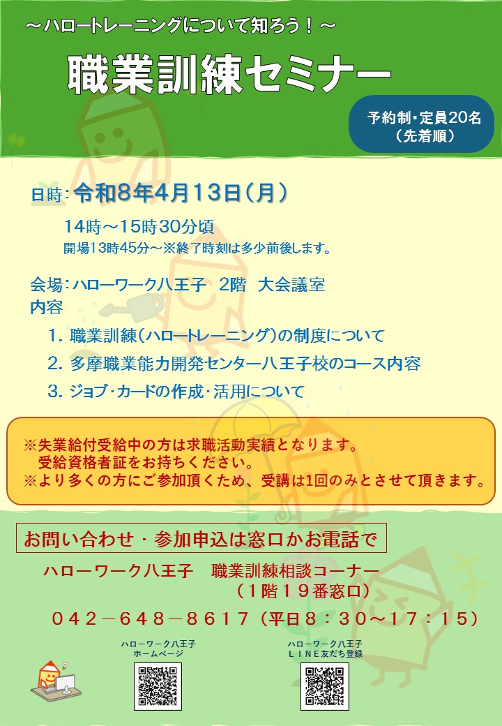 ハローワーク八王子では、再就職に必要な資格や知識・技能を修得するための「職業訓練」について、セミナーを開催いたします。