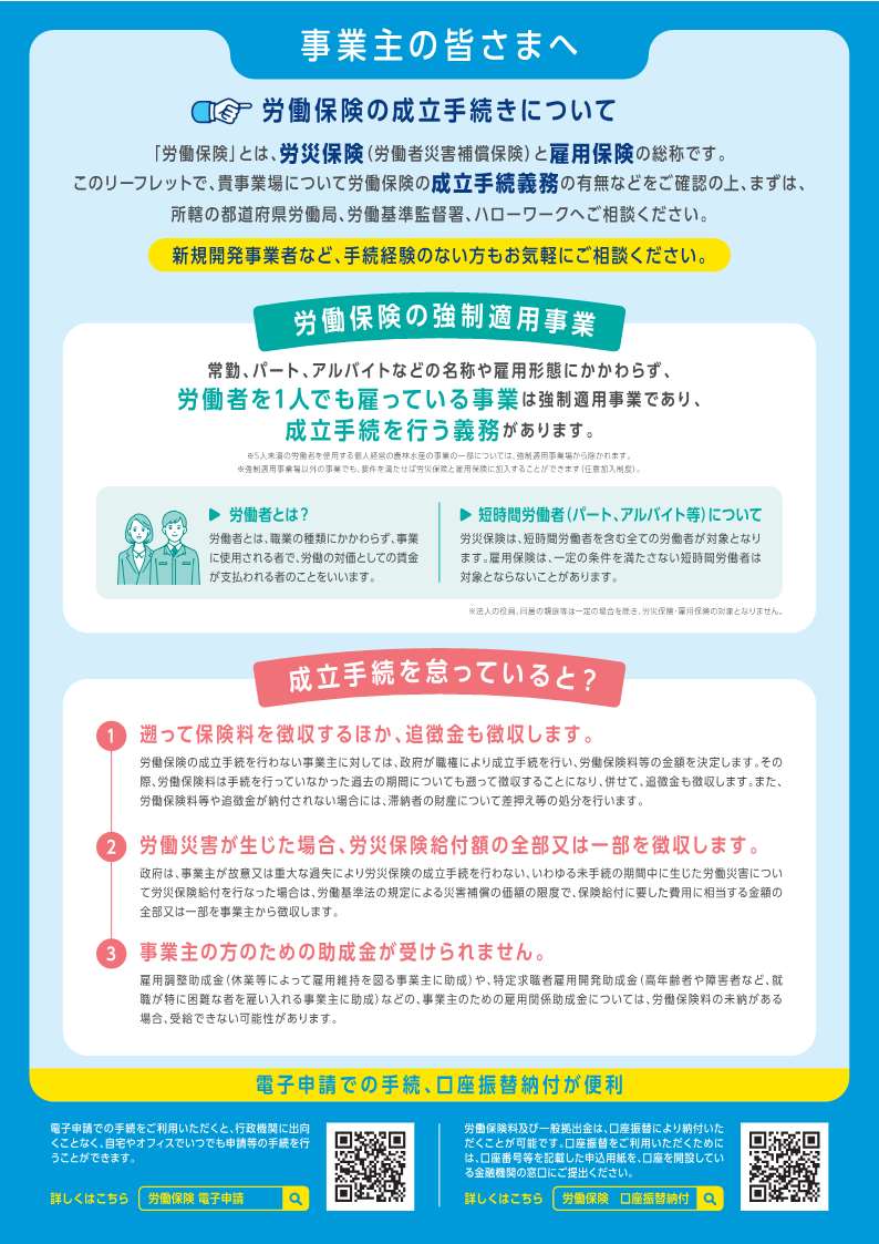 加入手続きがまだお済でない事業主の方は、所轄の労働基準監督署・ハローワーク(公共職業安定所)で手続きを行ってください。