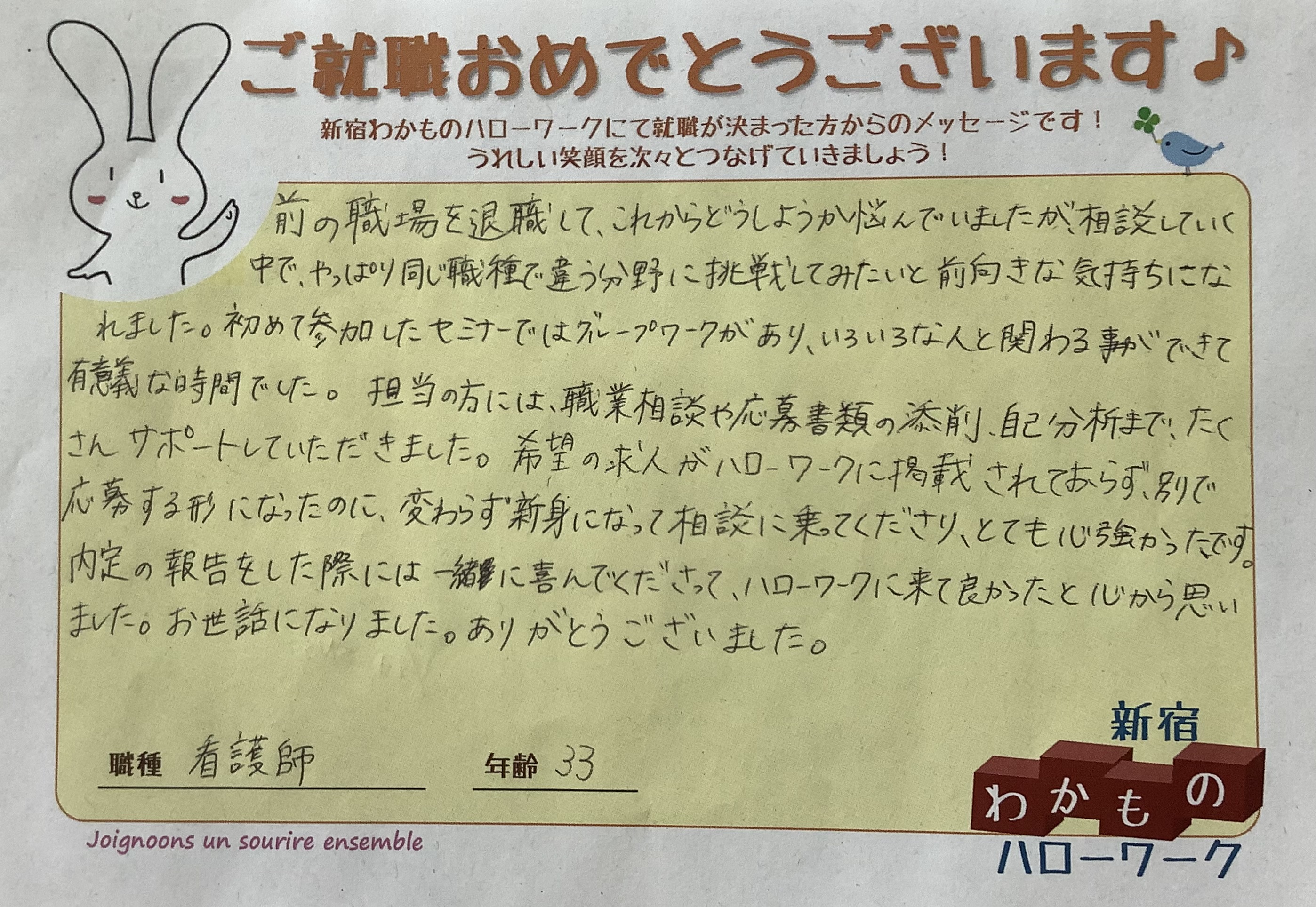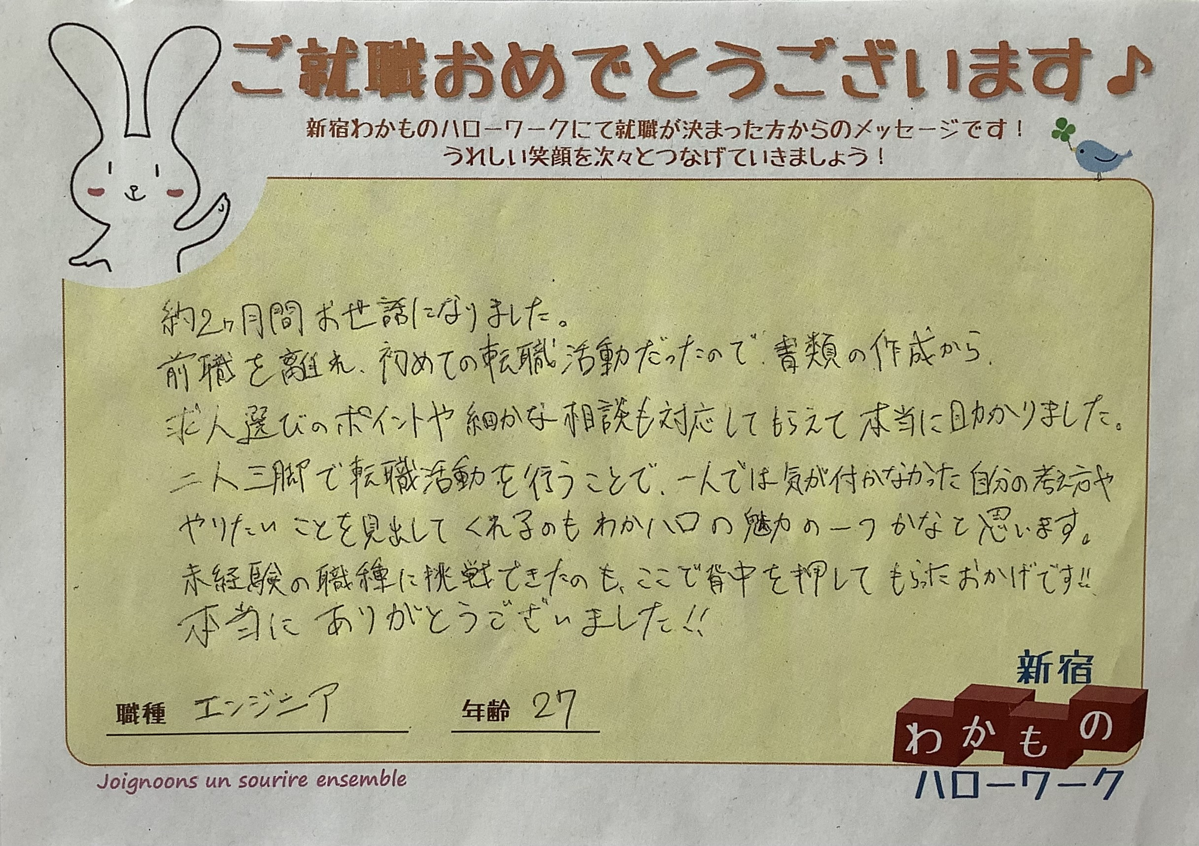 新たな職場でもがんばっていきたいと思います。新宿わかものハローワークに通わせて頂けたこと、とても感謝しています。ありがとうございました!!
