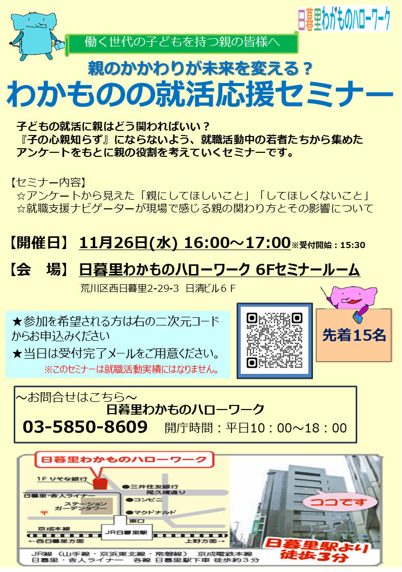 申し込みはこちら➡【働く世代の子どもを持つ親の皆様へ】11/26(水)わかものの就活応援セミナー