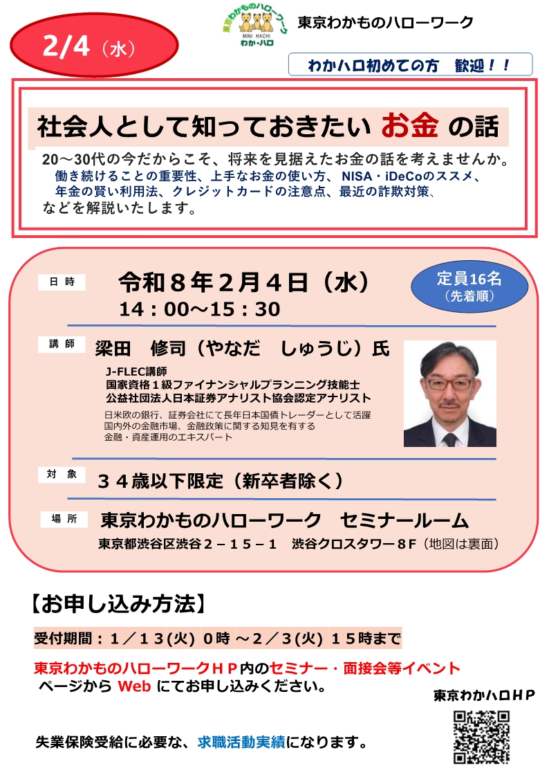2月4日㊌:社会人として知っておきたいお金の話 ※12月17日・1月21日と同内容のセミナーとなります