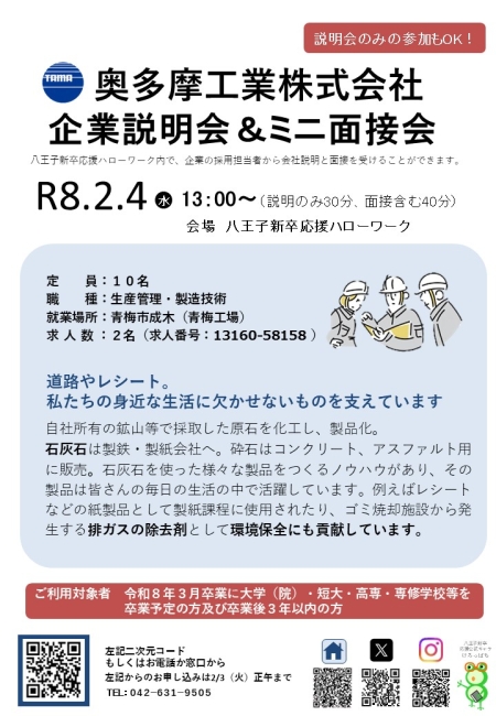 - 奥多摩工業株式会社 企業説明会&ミニ面接会(2/4水開催)