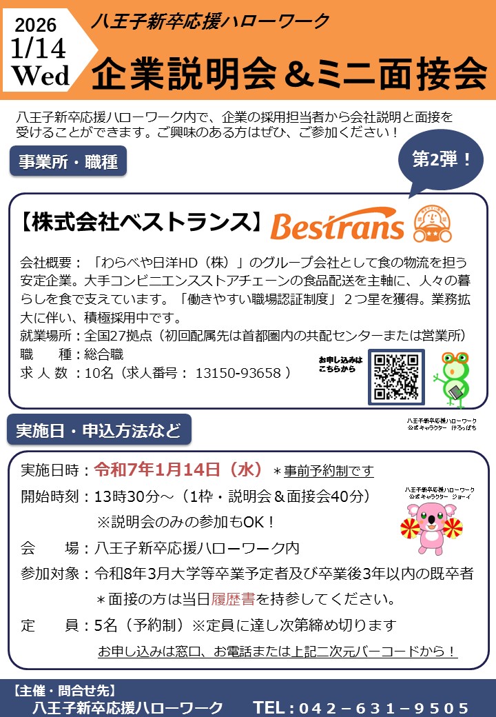 - 企業説明会&ミニ面接会 株式会社ベストランス 第2弾!(1/14開催)