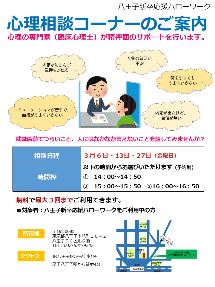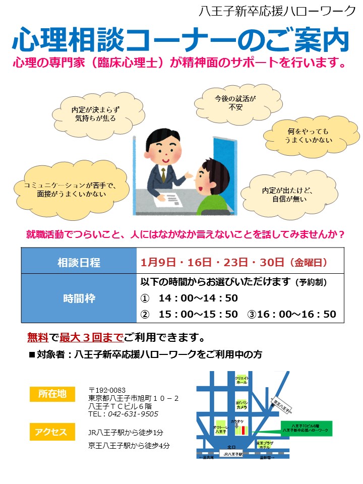 毎週金曜日(月によっては変更になる場合がございます)に就活の悩みや不安を抱える方を対象に、専門家(臨床心理士)による精神面のサポートを行います。